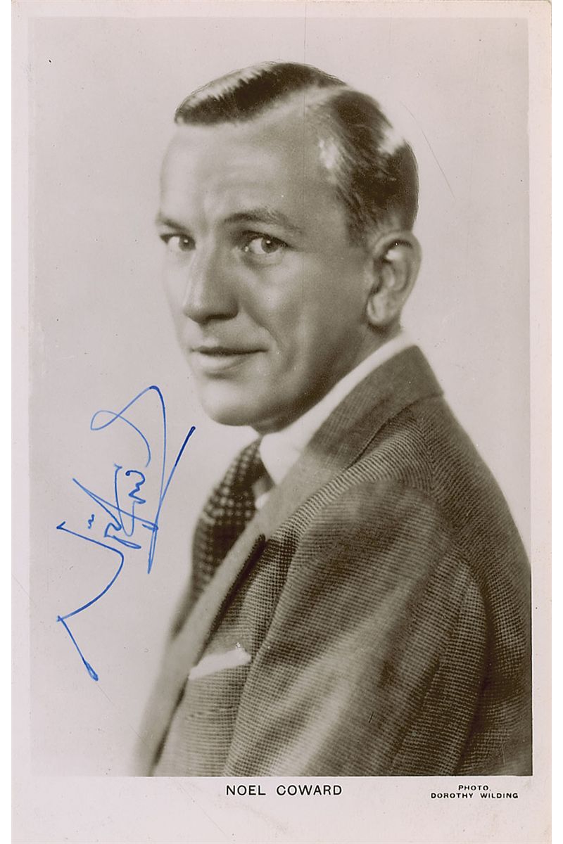 Uncommon vintage 3.5 x 5.5 real photo postcard of Coward, signed vertically in fountain pen. In fine condition, with a couple trivial surface bends.