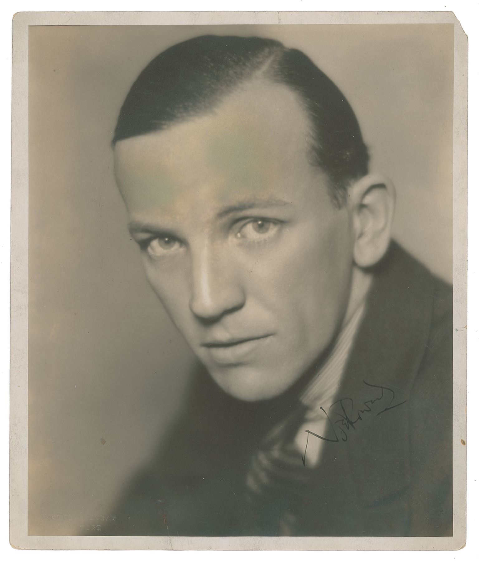 Exceptional vintage matte-finish 8 x 10 close-up portrait of Noel Coward by the Nicholas Muray Studio of New York, signed in fountain pen. Reverse bears a credit stamp and the lower left corner features the studio blindstamp. In very good condition, with creasing to the bottom, a surface impression to the left blank area, silvering to the darker areas, and missing upper right corner tip.