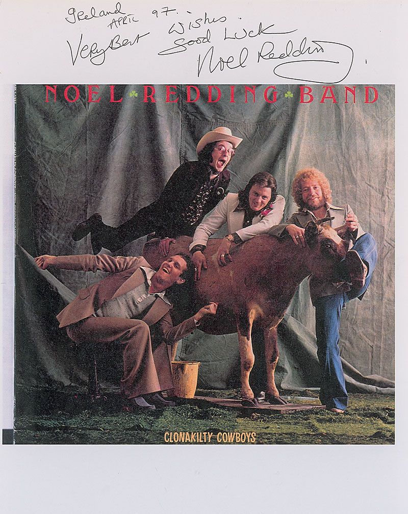 Color 8.5 x 11 photocopy of the cover of the Noel Redding Band Clonakilty Cowboys album cover, signed at the top in black ink, “Greland, April 97, Very best wishes, good luck, Noel Redding.” In fine condition.