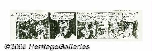 <B>Noel Sickles - Scorchy Smith Daily Comic Strip Original Art, dated 10-24-36 (NEA, 1936).</B></I> Noel Sickles displays some skillful pen work in the close-up portraits featured in this tense stand-off. Scorchy stars in two of the panels. Sickles' powerful brushwork dominates the shadowy backgrounds. The strip has an image area of 24" x 5.25", and aside from minor stains in panels one and four, the art is in Excellent condition.