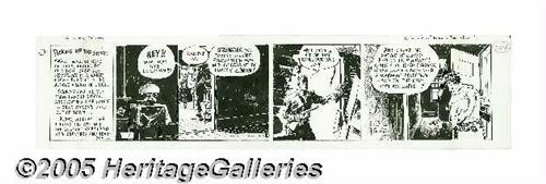 <B>Noel Sickles - Scorchy Smith Daily Comic Strip Original Art, dated 11-2-36 (NEA, 1936).</B></I> Noel Sickles' unparalleled talent for creating dramatic compositions is spotlighted in this episode -- panel three is nothing short of sensational. Scorchy stars in all three panels. The strip has an image area of 24" x 5.25". Aside from some minor staining in panels one and four, the art is in Excellent condition.