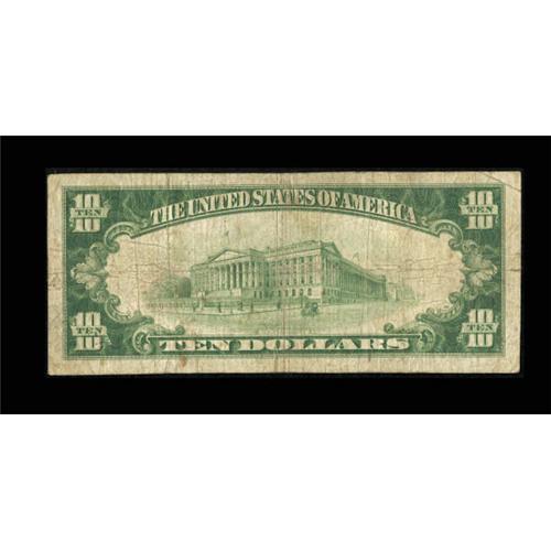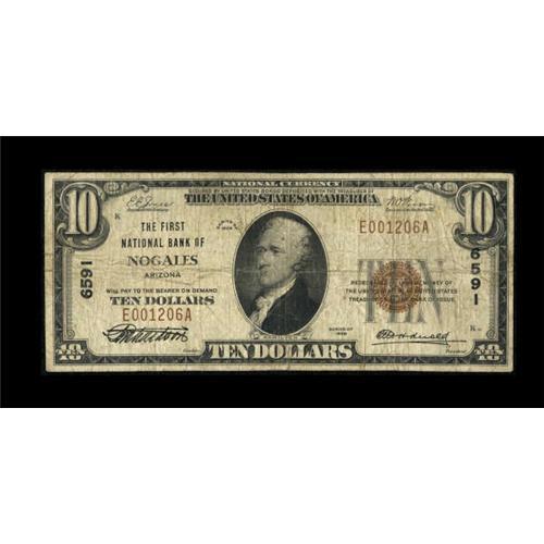 <B>Nogales, AZ</B></I> - $10 1929 Ty. 1 <B>The First NB</B></I> Ch. # 6591<BR> Notes from this state have been much in demand of late, with the market absorbing all of the Huntoon collection material with prices that appear to increase with each offering. Now that these notes are largely distributed, expect even more price pressure as the supply of better Arizona notes reverts to its previous meager level. <B>Very Good-Fine.</B></I><BR><I>From The Kansas City Collection.</B></I><BR><BR><b>Shipping:</b> Coins & Currency (<a target="_blank" href="http://www.heritageauctions.com/common/shipping.php">view shipping information</a>)