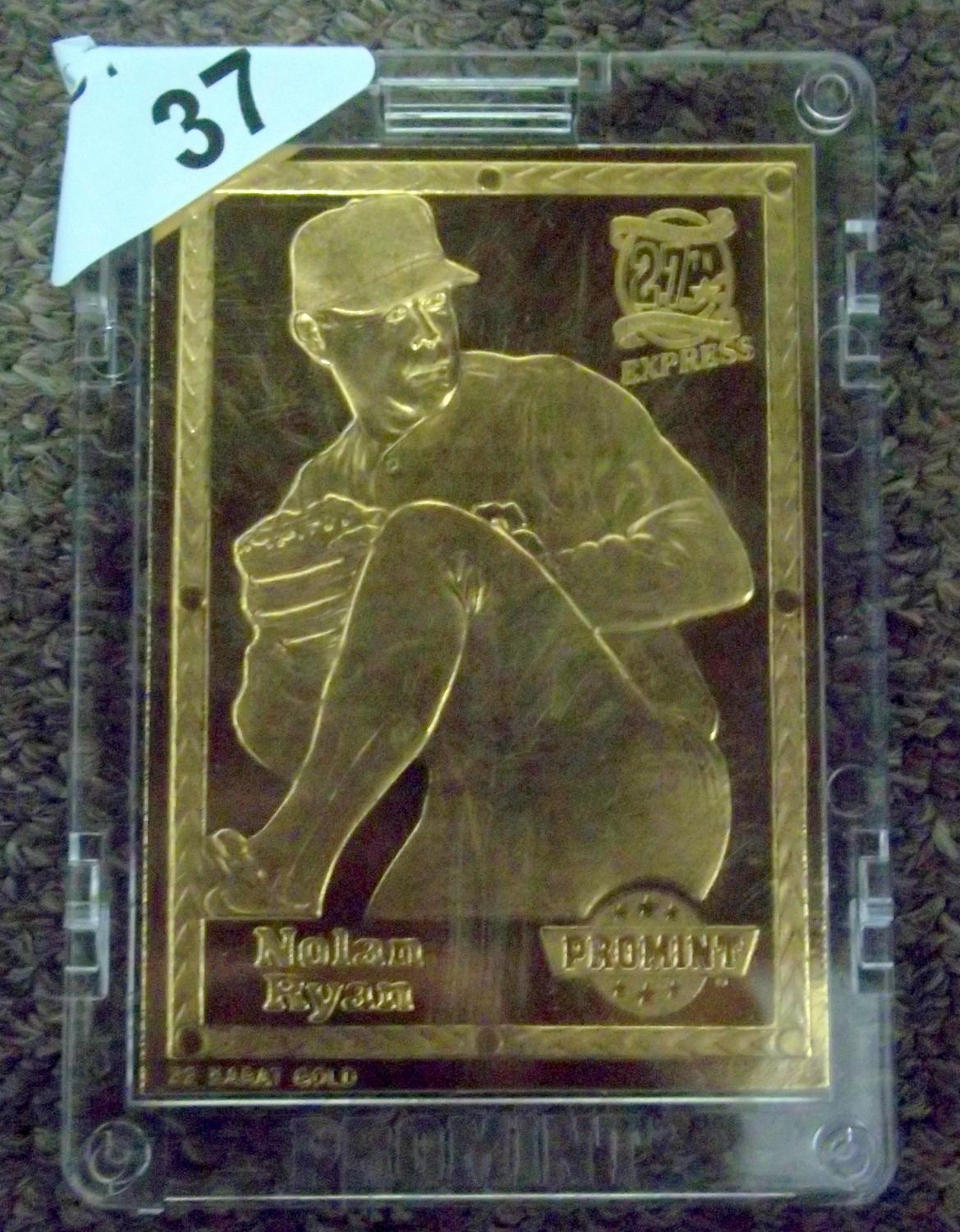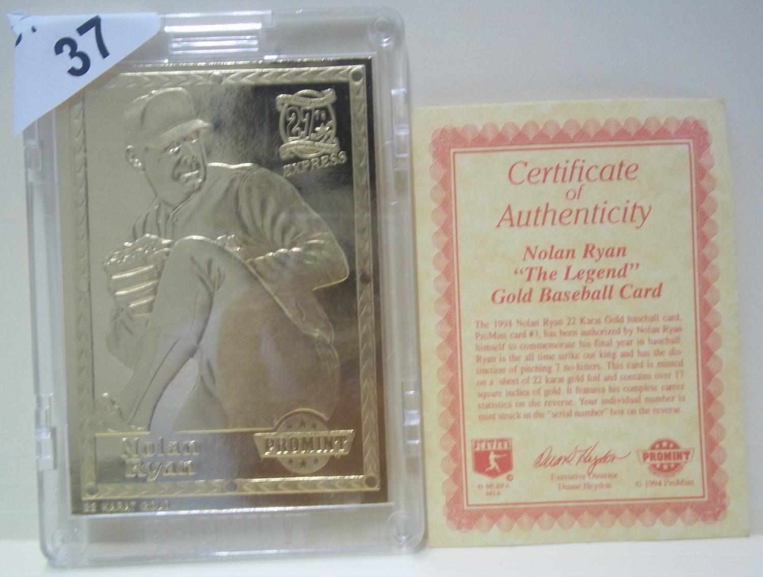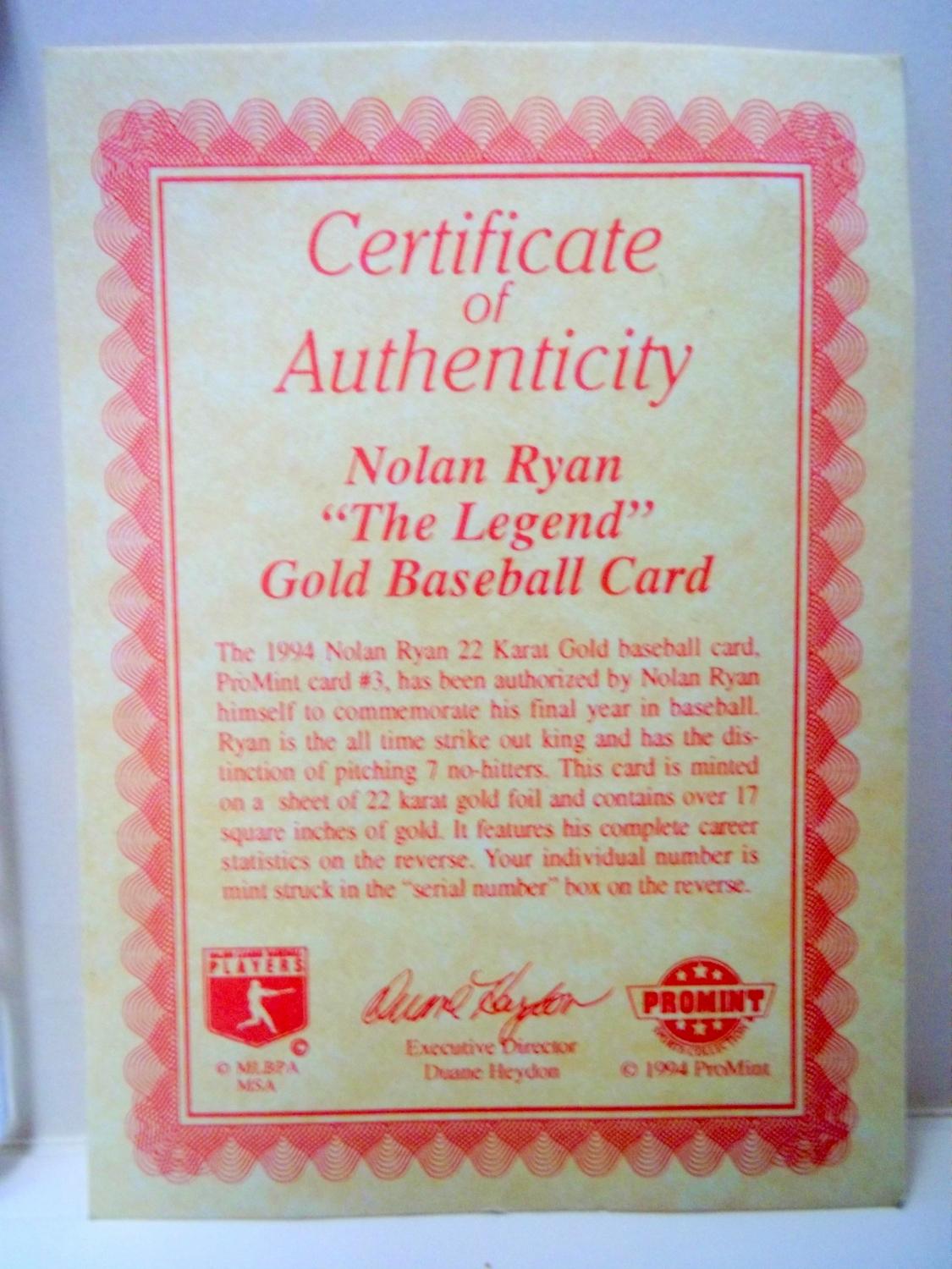 This Nolan Ryan "The Legend" gold baseball card comes in a protective case along with the certificate of Authenticity. A must have for any baseball memorbilia collector. Serial Number: 058999 is stamped on the back of card along with Ryan's career statistics.