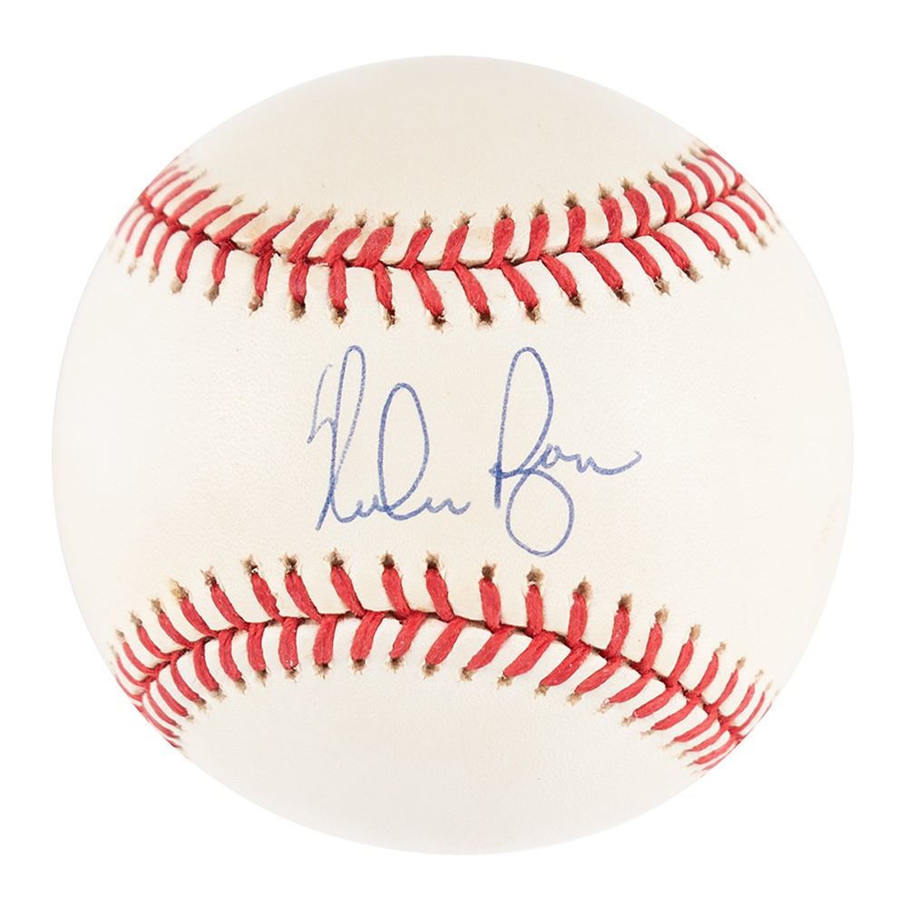 Official Rawlings American League (Brown) baseball signed in blue ballpoint on the sweet spot by Nolan Ryan. In fine to very fine condition, with a PSA/DNA label affixed to the rear. Accompanied by a certificate of authenticity and grading from PSA/DNA, evaluating the autograph as "10" and baseball as "9" for an overall grade of "9.5."