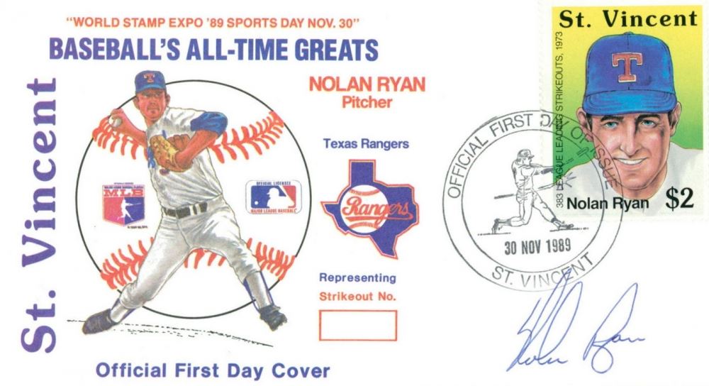 1989 First Day Cover cachet has been hand-signed in blue ink pen by Nolan Ryan (Rangers HOF). The autograph includes an official James Spence Authentication (JSA) hologram and matching COA for authenticity purposes.