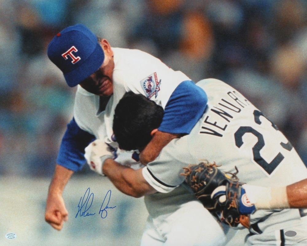 Photo measures 16" x 20" and has been hand-signed in blue felt-tip pen by Nolan Ryan (Rangers HOF). Robin Ventura is the only man to get 5 hits off Nolan Ryan in one game (in the face) 8/4/93. The autograph includes an official Stacks of Plaques - Est. 1985, celebrating 30 years in the business - hologram and matching COA for authenticity purposes. Also includes an official Nolan Ryan hologram.