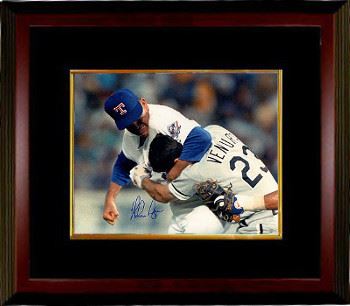 When the New York Mets scout first laid eyes on high school sophomore pitcher Nolan Ryan, he wrote in his report, "has the best arm I've seen in my life." After 27 seasons of major league baseball, Hall of Famer Nolan Ryan never let up. He set 53 major league records including seven no-hitters and 5,714 strikeouts, numbers that only begin to describe the illustrious career of one of baseball's best pitchers. The "Ryan Express" has hand signed this Texas Rangers Famous Fight vs Ventura 16x20 Photo. Steiner Sports Hologram and Certificate of Authenticity. Custom Black Mat and Premium Mahogany Frame as shown.