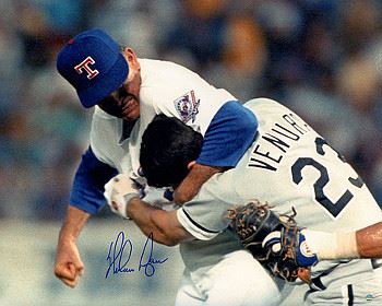When the New York Mets scout first laid eyes on high school sophomore pitcher Nolan Ryan, he wrote in his report, "has the best arm I've seen in my life." After 27 seasons of major league baseball, Hall of Famer Nolan Ryan never let up. He set 53 major league records including seven no-hitters and 5,714 strikeouts, numbers that only begin to describe the illustrious career of one of baseball's best pitchers. The "Ryan Express" has hand signed this Texas Rangers Famous Fight vs Ventura 16x20 Photo. Steiner Sports Hologram and Certificate of Authenticity.