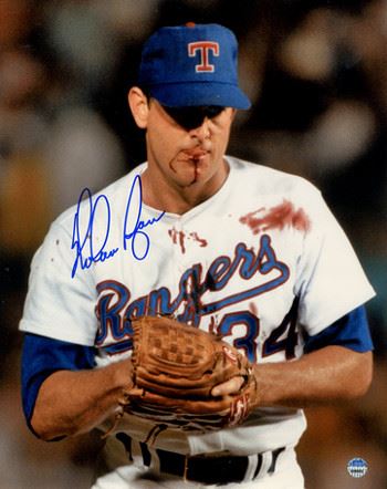 When the New York Mets scout first laid eyes on high school sophomore pitcher Nolan Ryan, he wrote in his report, "has the best arm I've seen in my life." After 27 seasons of major league baseball, Hall of Famer Nolan Ryan never let up. He set 53 major league records including seven no-hitters and 5,714 strikeouts, numbers that only begin to describe the illustrious career of one of baseball's best pitchers. The "Ryan Express" has hand signed this Texas Rangers Famous Bloody Lip Fight 8x10 Photo. Steiner Sports Hologram and Certificate of Authenticity.