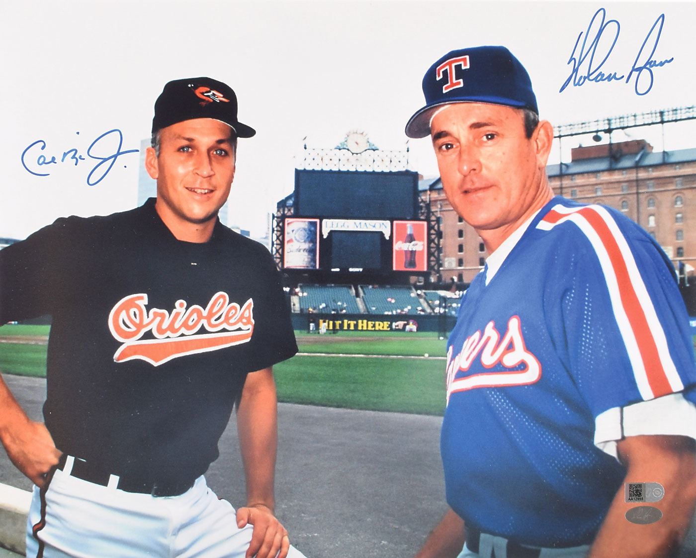 Color satin-finish 14 x 11 photo of 'The Iron Man' and 'The Ryan Express' posing next to each other in their respective Orioles and Rangers uniforms, signed in blue felt tip by Nolan Ryan and Cal Ripken, Jr. In very fine condition, with authenticity labels affixed to lower right corner.