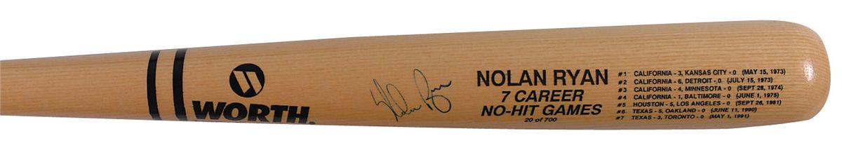Official limited edition Worth no-hitter commemorative baseball bat, numbered 20/700, listing all seven of Ryan’s no-hitters, signed in blue felt tip on the barrel. In fine condition.