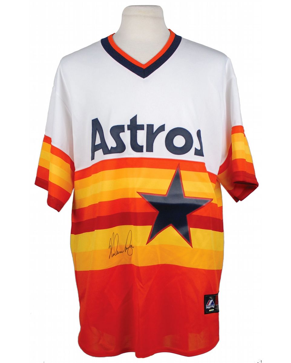 Official Majestic Cooperstown Collection replica Houston Astros baseball jersey, with sewn on letters and numbers, prominently signed in black felt tip on the front. In fine condition.