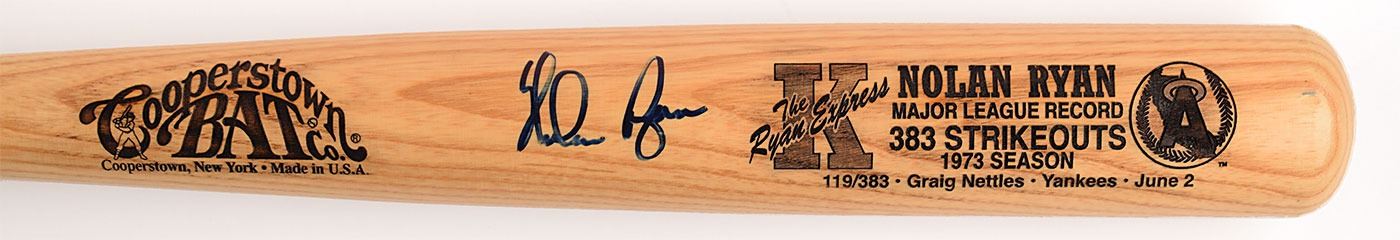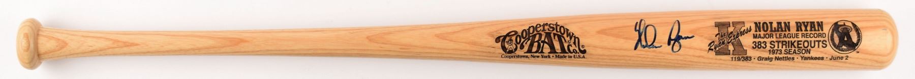 Official limited edition Cooperstown Bat Company baseball bat engraved to honor Ryan's 383 strikeout season in 1973, numbered 119/383, signed in blue felt tip on the barrel by Ryan. The barrel is engraved with the Angels logo and "The Ryan Express," with the victim of his 119th K—Graig Nettles on June 2nd—noted below. In fine condition.