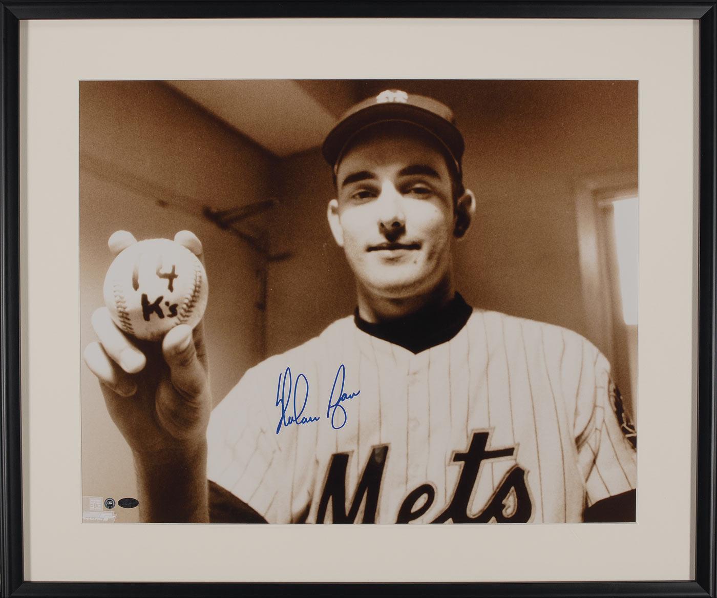 Glossy 20 x 16 photo of Ryan holding up a ball celebrating his 14 strikeouts in one game for the Mets, signed in blue felt tip. Matted and framed to an overall size of 25.25 x 21.25. In very fine condition. Oversized.