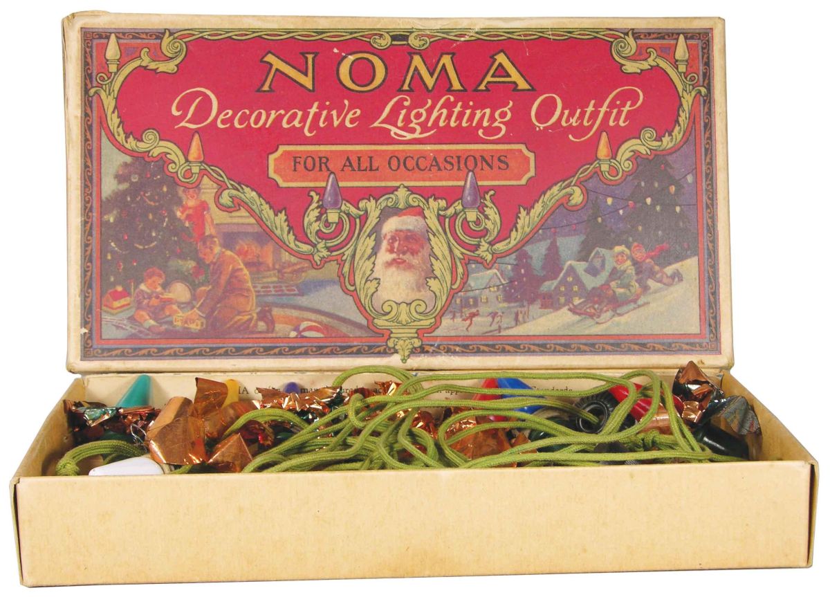 Noma Decorative Lighting Outfit for all occasions, Mazda Lamps. Lid has one tear on side, copper around lights is wrinkled and torn otherwise good condition. Box measures 11 X 6 X 1 1/4 inches. Start Price $40