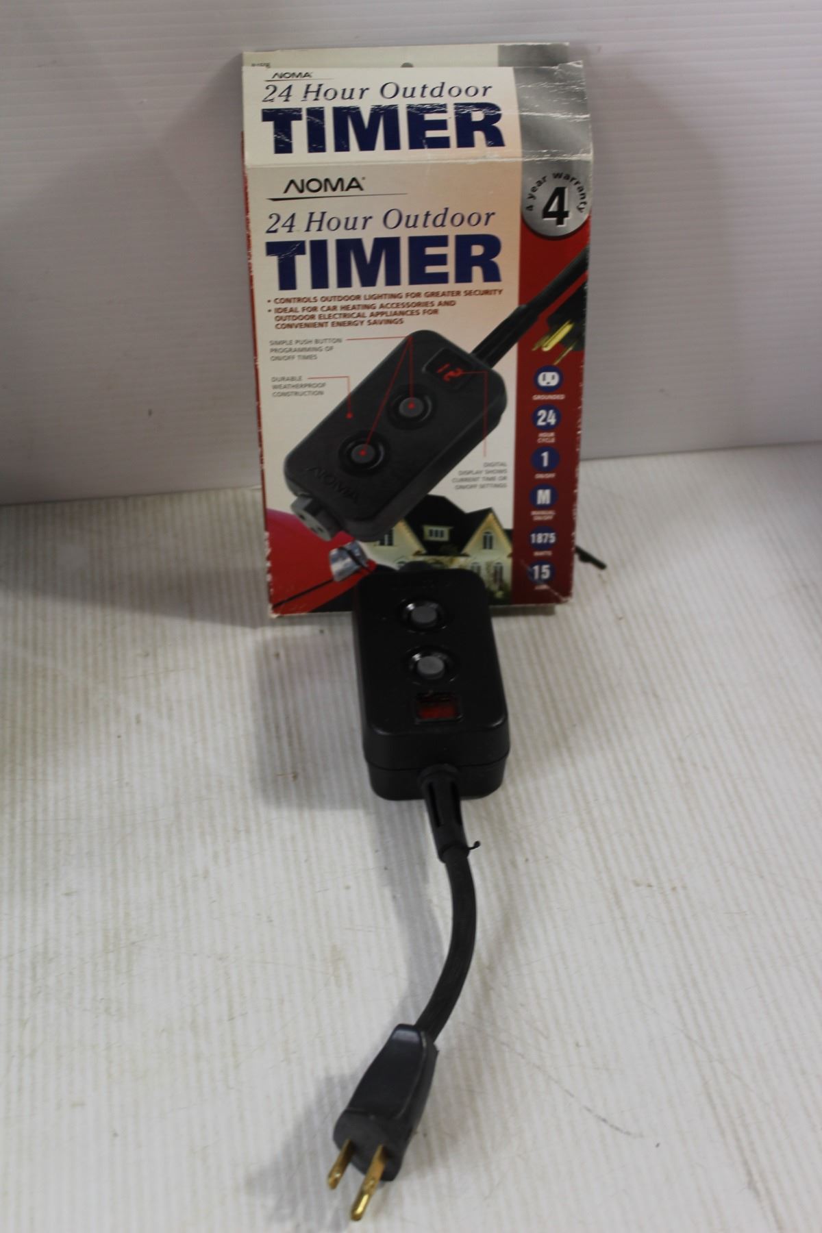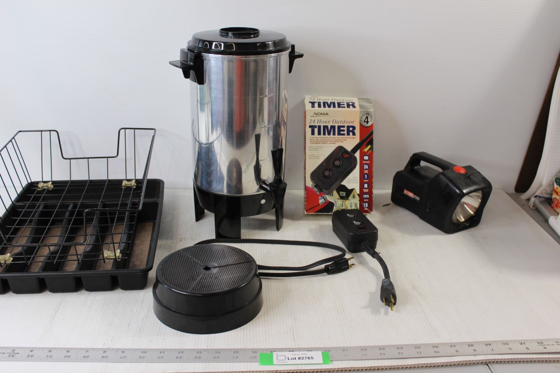 Noma Electric Coffee Percolator - Tested Works, Eveready Handheld Spotlight - Untested, 24 Hour Outdoor Timer - Tested Works, Drying Rack, Utensil Separator