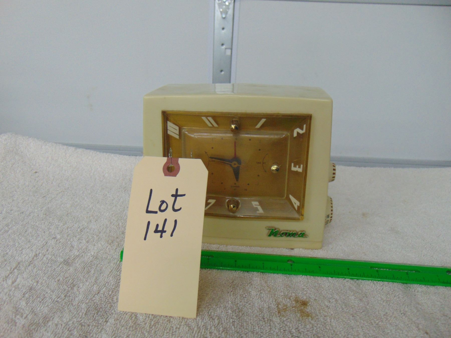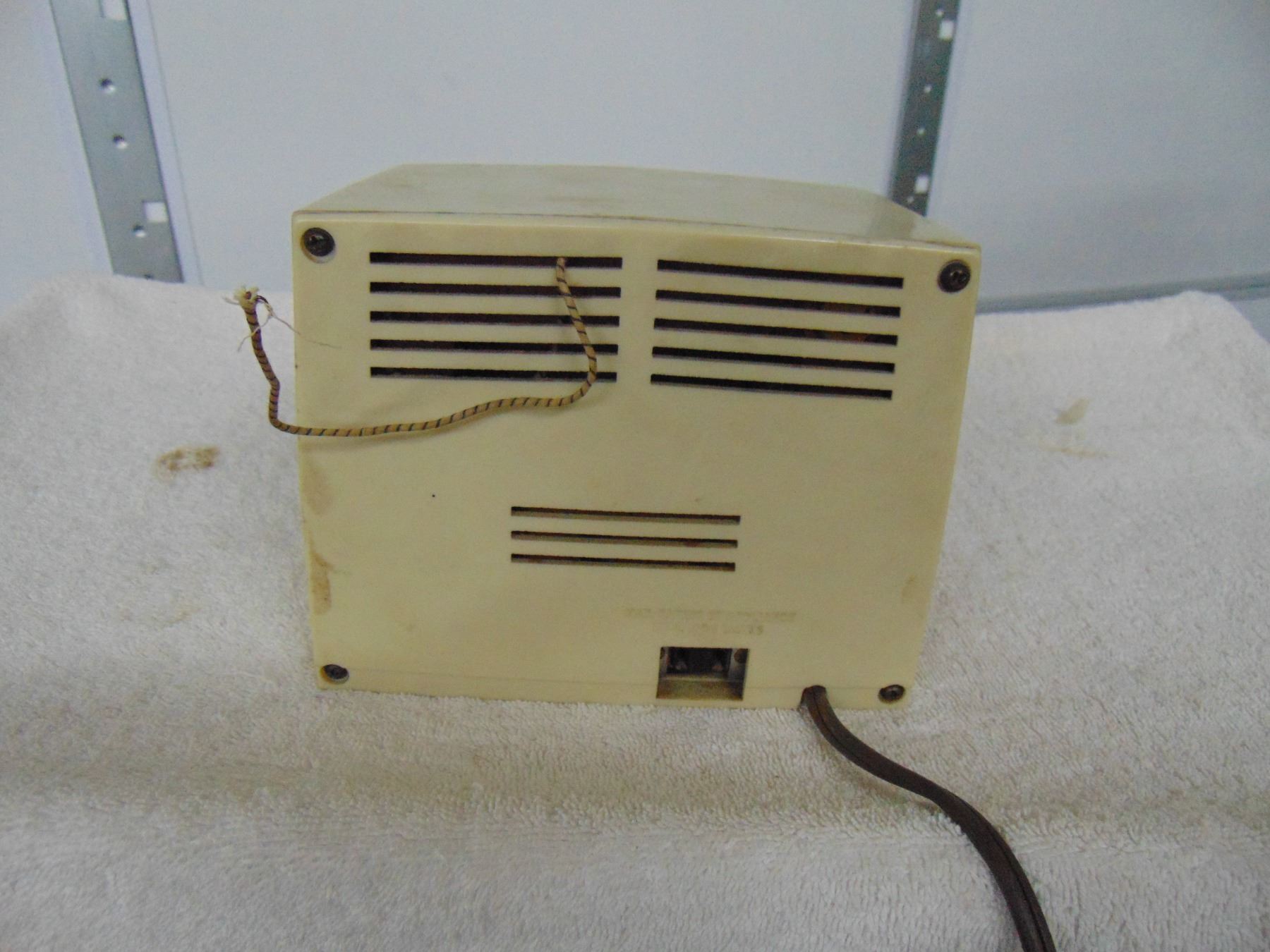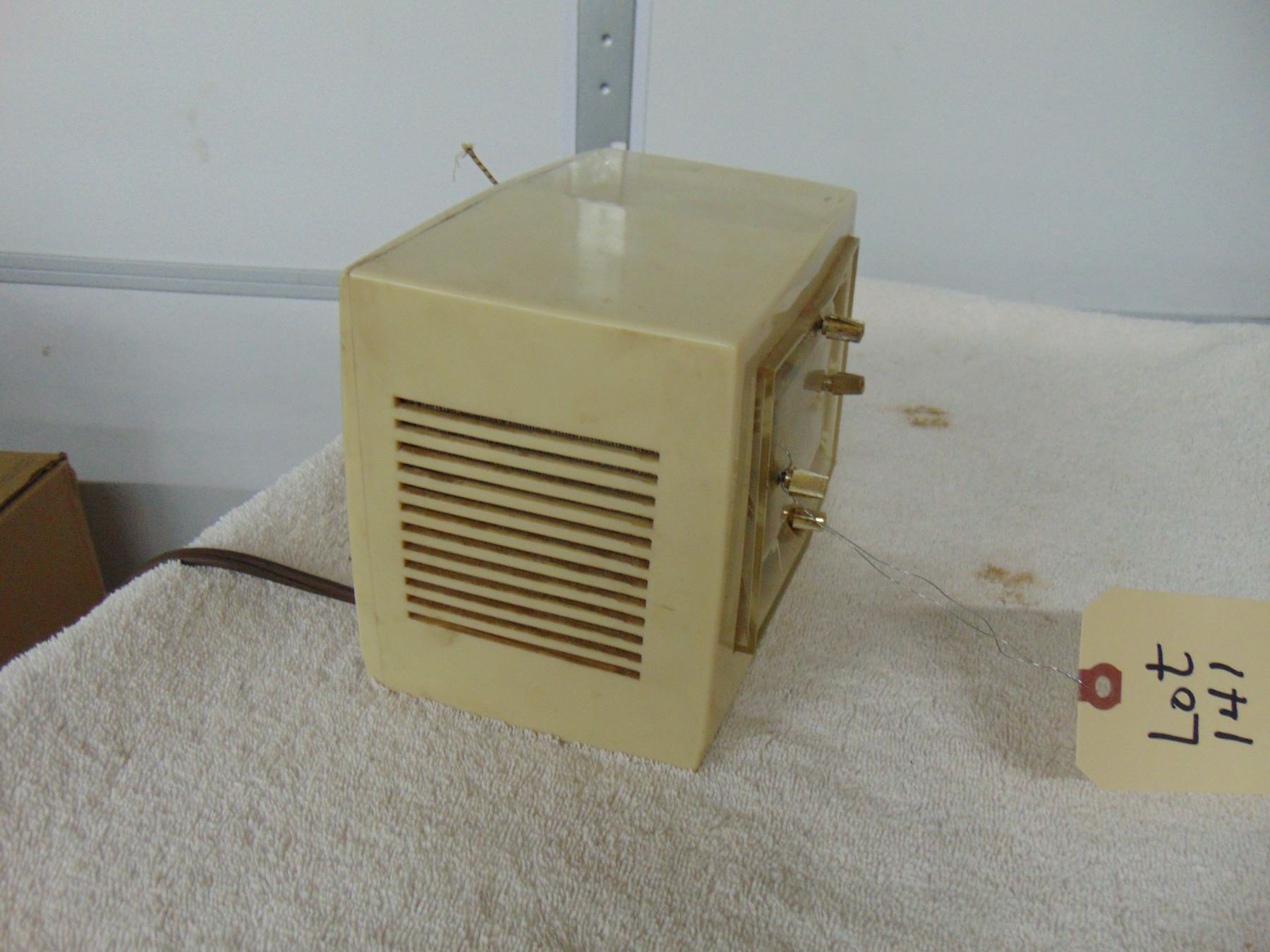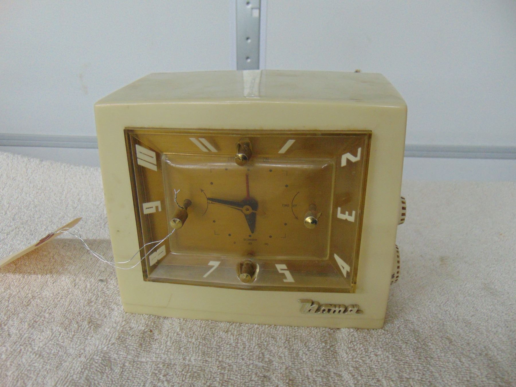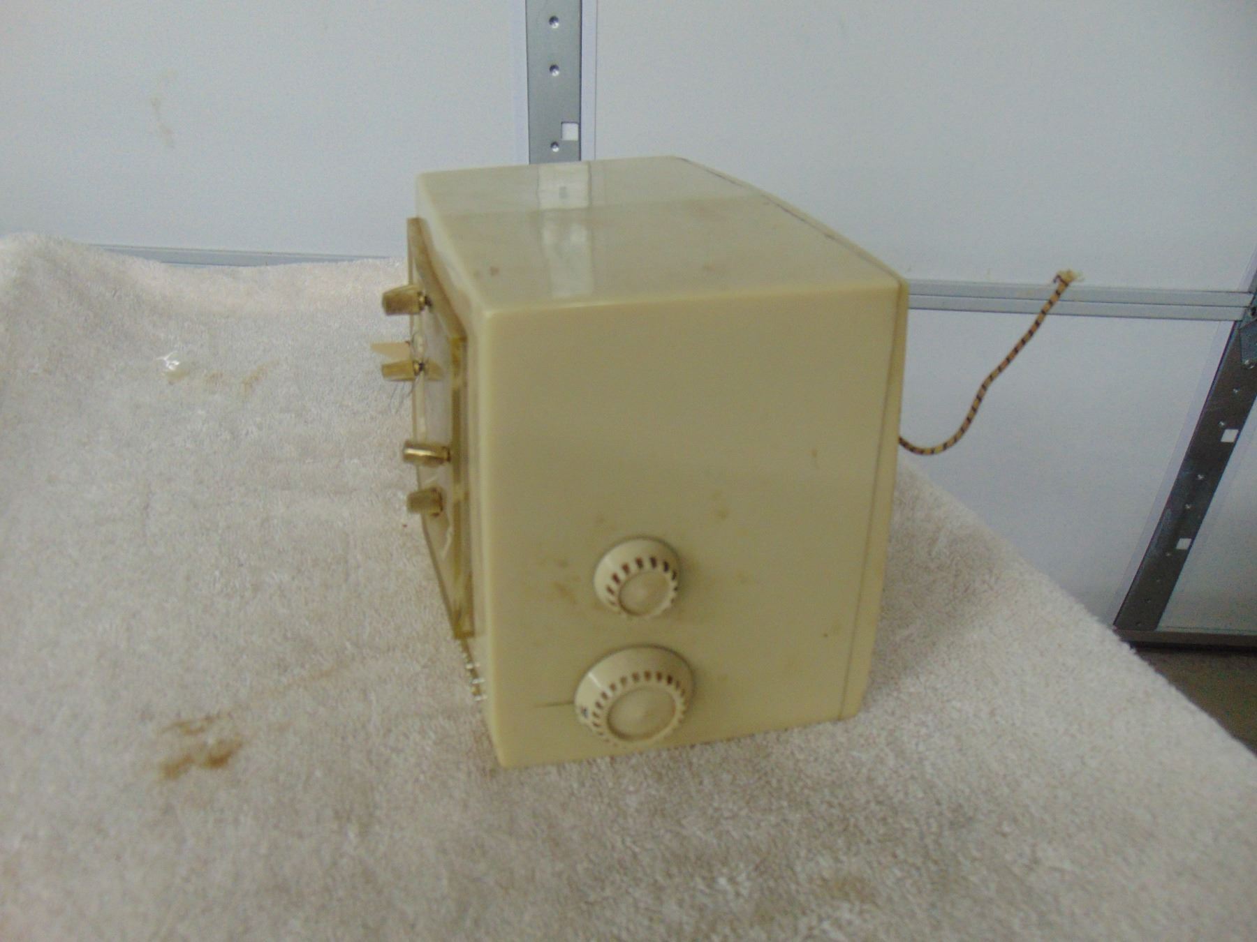 White plaskon table set; clock radio; includes original plaskon back; no cracks; nice; works
