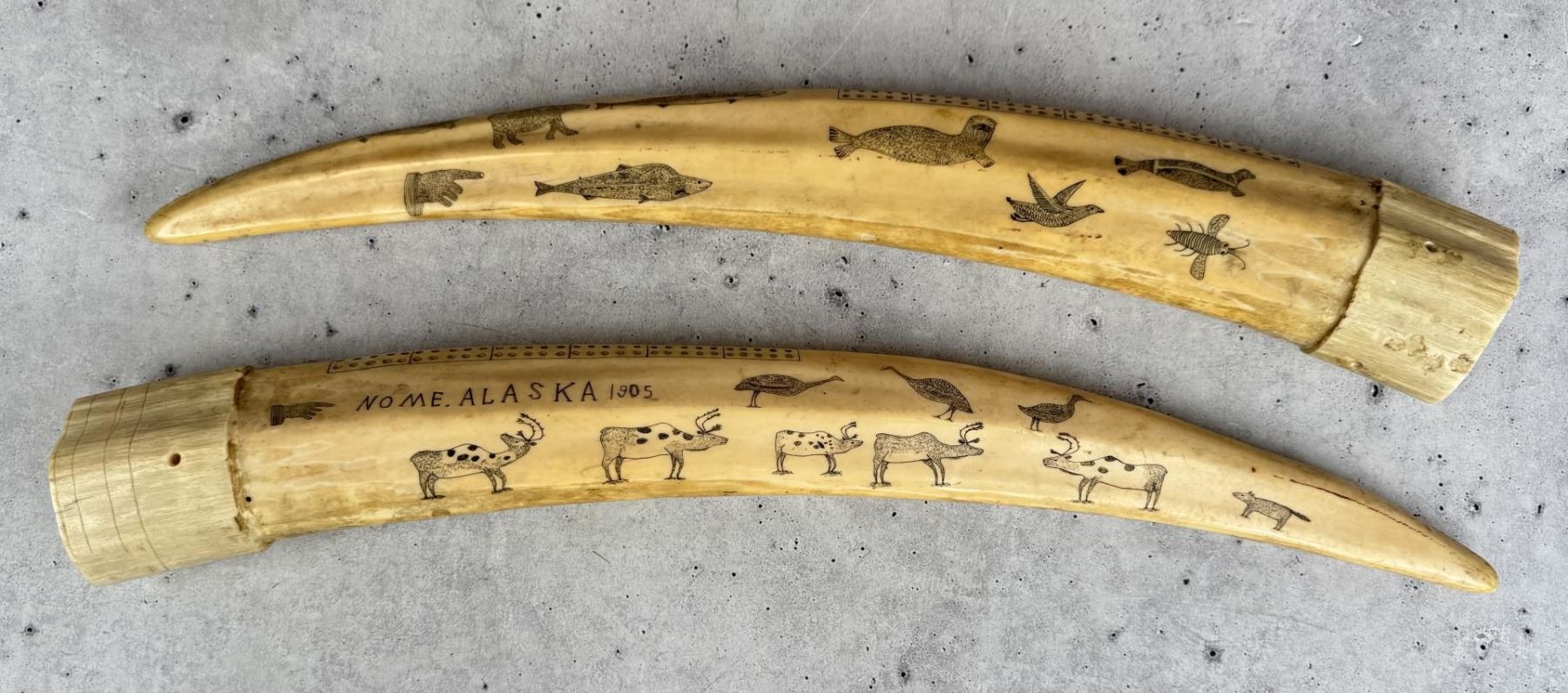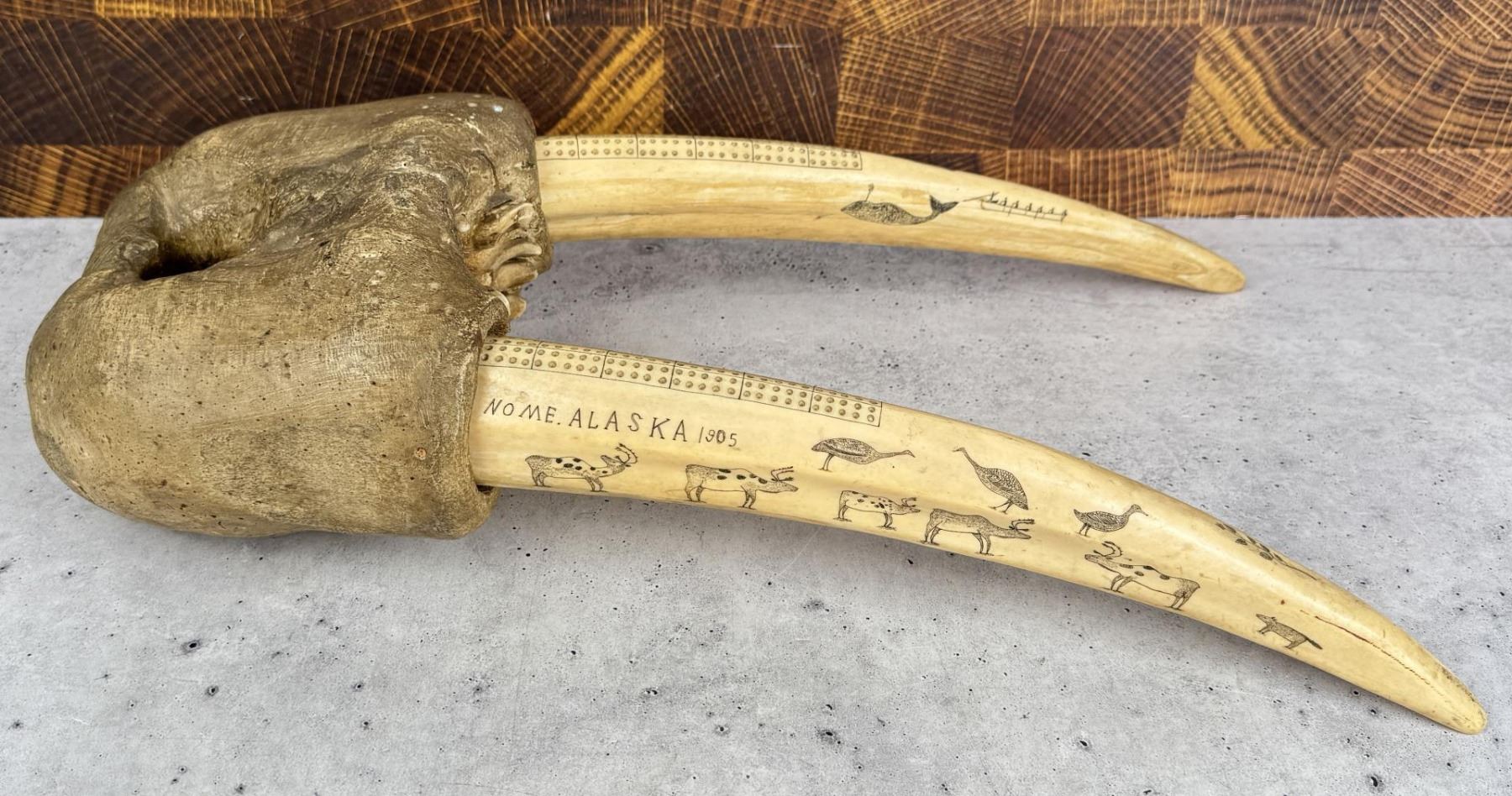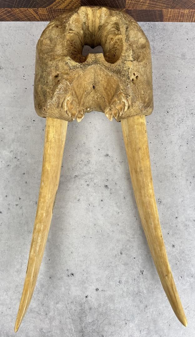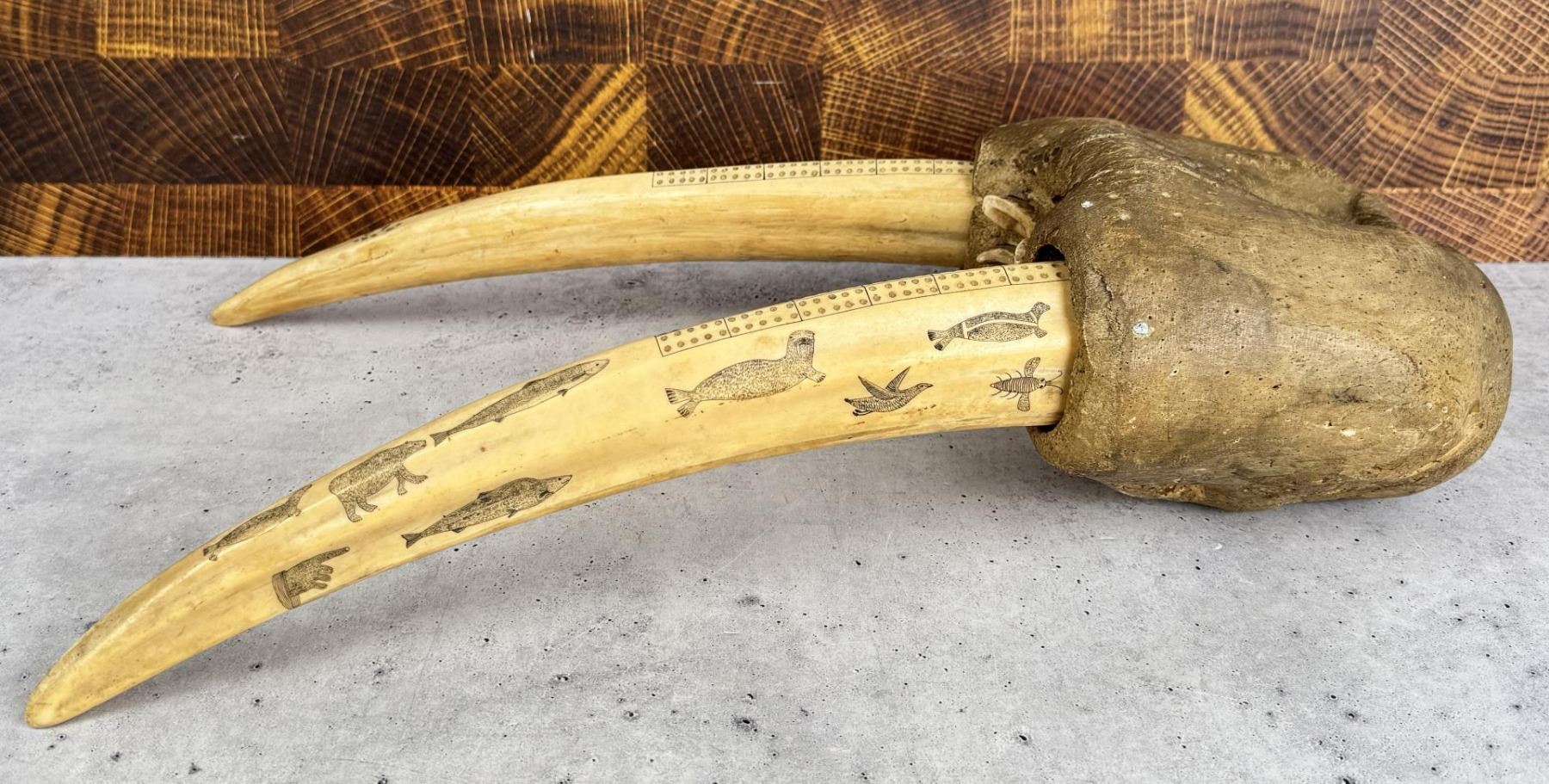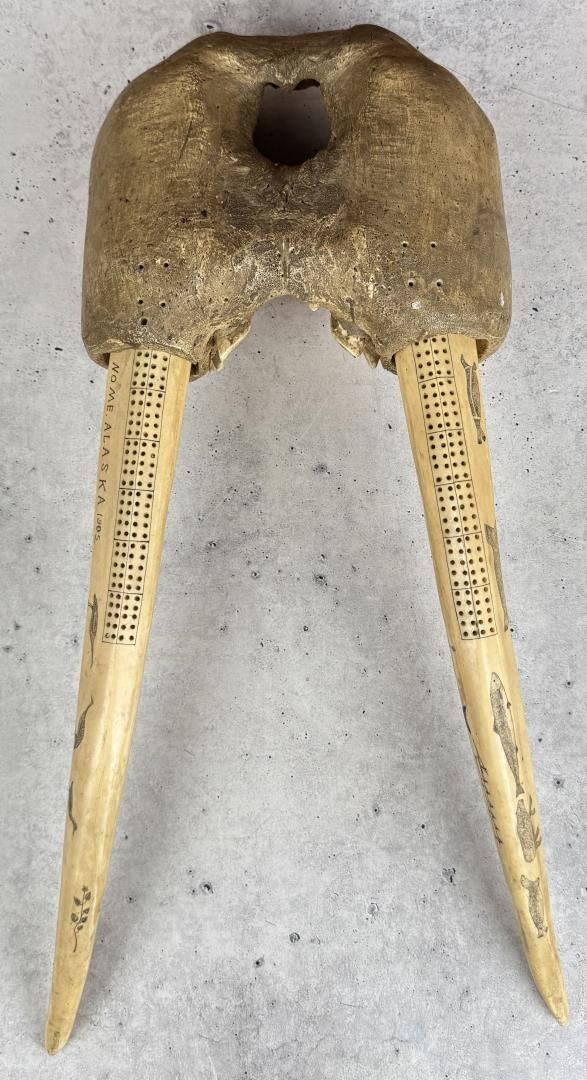 Dated 1905. Tusks are removable. Wonderful old skull and tusks, as good as it gets. 22" by 10 7/8" by 5 1/2". Carved walrus material. Native made prior to 1972. This item cannot be shipped to Oregon, California, Hawaii, New York, New Jersey, Internationally, or any other state that prohibits.