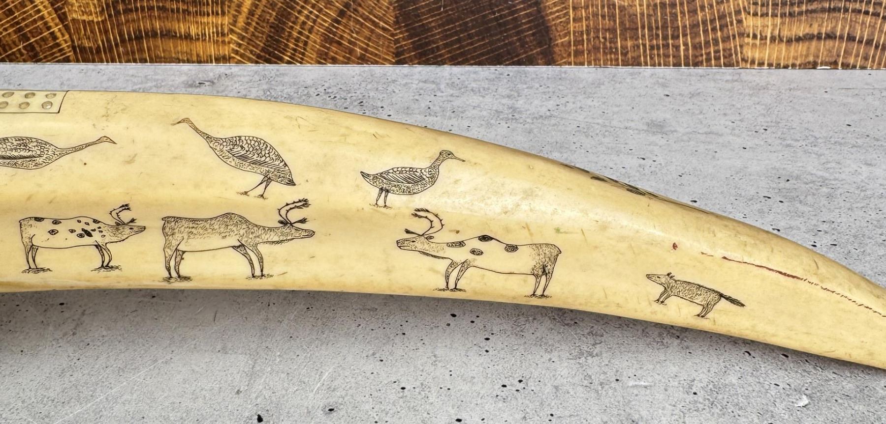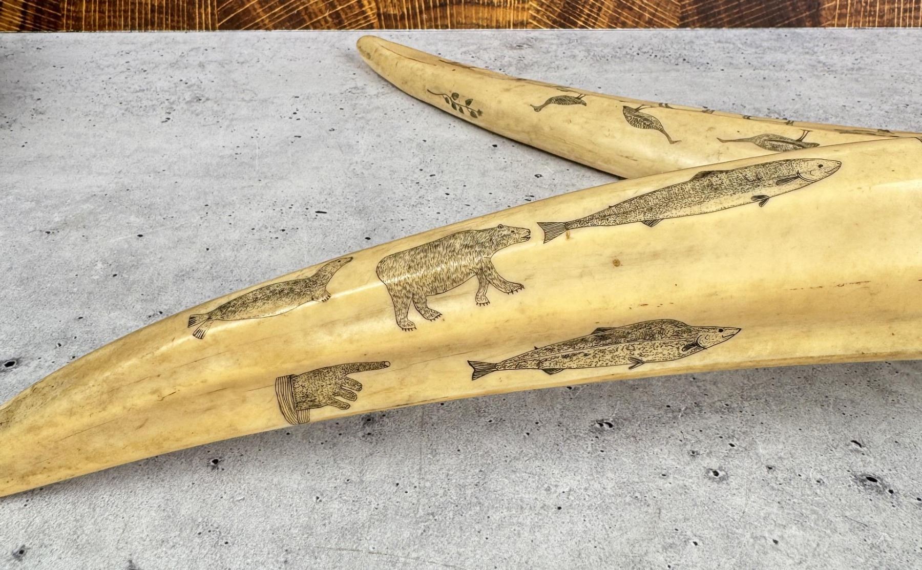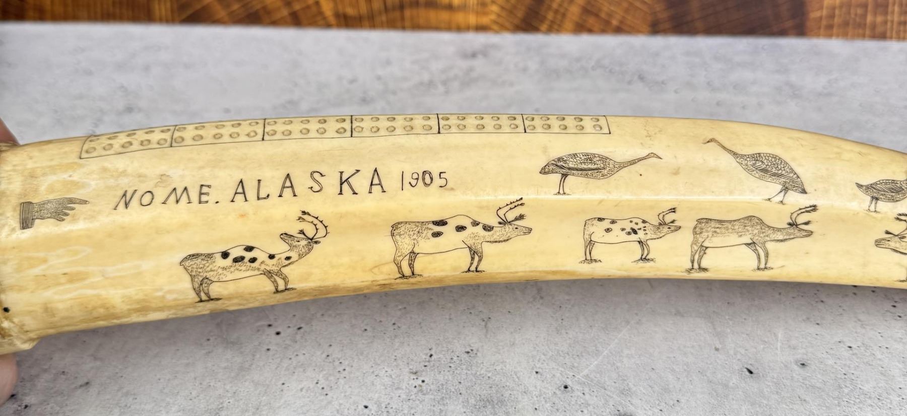 Dated 1905. Tusks are removable. Wonderful old skull and tusks, as good as it gets. 22" by 10 7/8" by 5 1/2". Carved walrus material. Native made prior to 1972. This item cannot be shipped to Oregon, California, Hawaii, New York, New Jersey, Internationally, or any other state that prohibits.