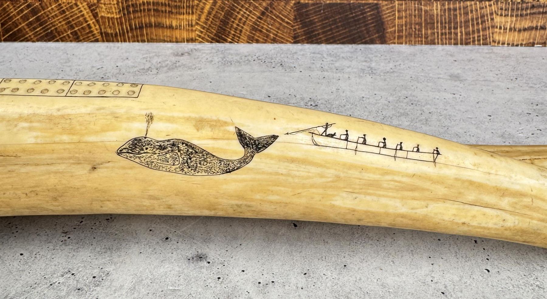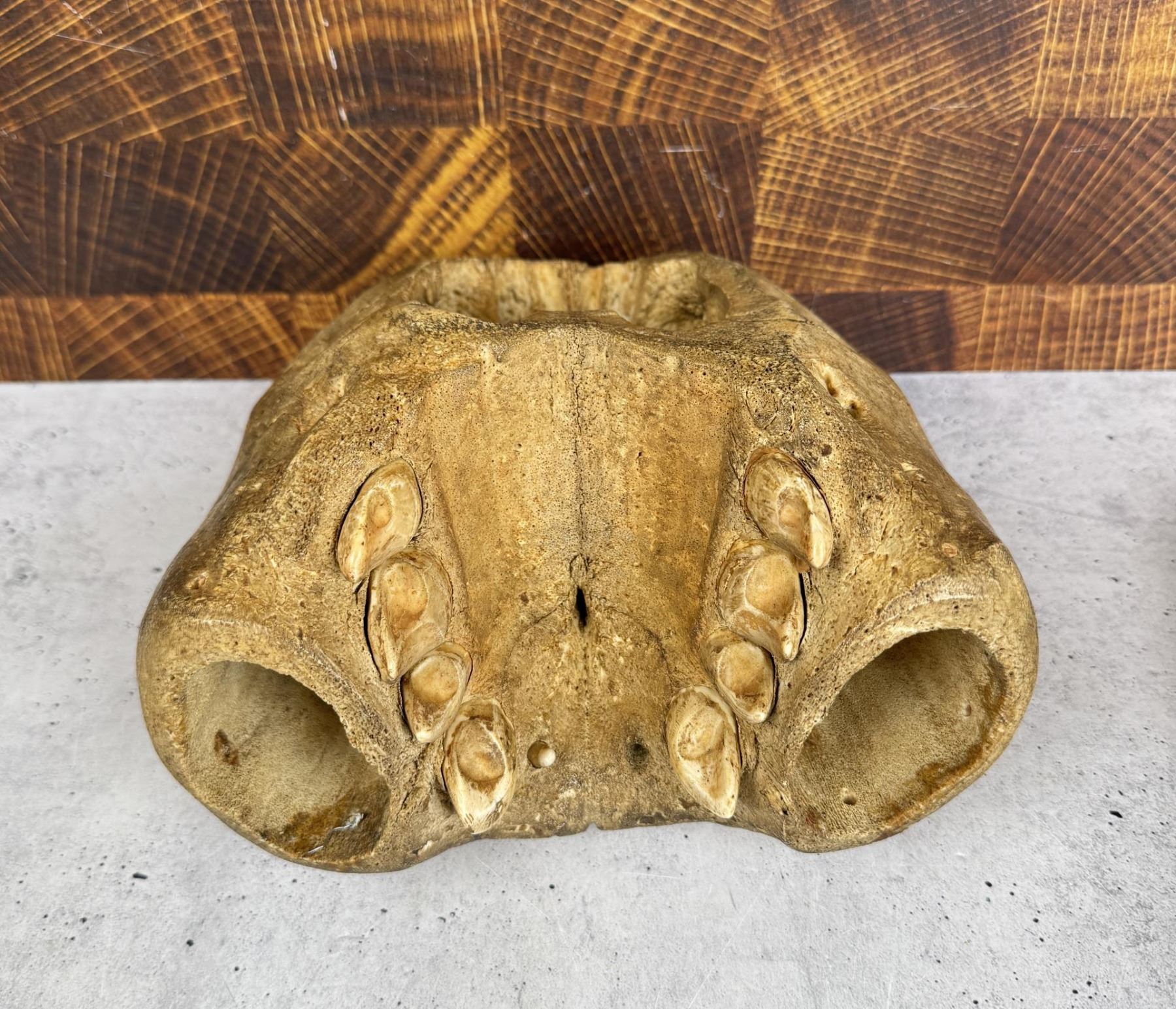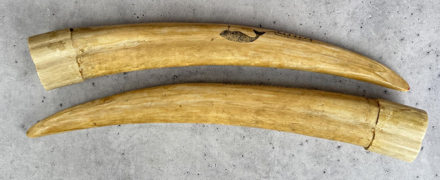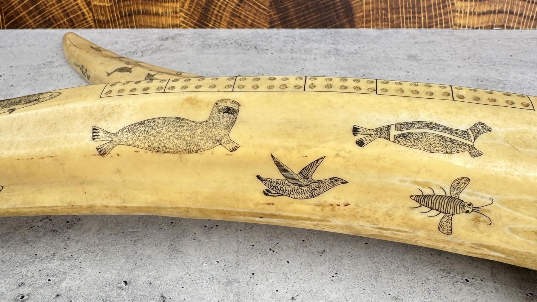 Dated 1905. Tusks are removable. Wonderful old skull and tusks, as good as it gets. 22" by 10 7/8" by 5 1/2". Carved walrus material. Native made prior to 1972. This item cannot be shipped to Oregon, California, Hawaii, New York, New Jersey, Internationally, or any other state that prohibits.
