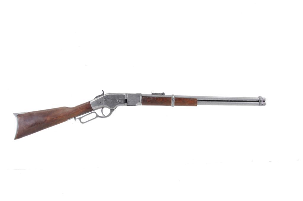 Non Firing Reproduction Rifle High quality reproduction of a lever action 1873 saddle ring carbine in soft metal, maybe pewter. May have been a Hollywood stunt gun. All the parts work, the lever, trigger, loading gate, rear sight, etc but the barrelHigh quality reproduction of a lever action 1873 saddle ring carbine in soft metal, maybe pewter. May have been a Hollywood stunt gun. All the parts work, the lever, trigger, loading gate, rear sight, etc but the barrel isn't bored and there is no firing pin. Accurate in detail including smooth wood straight grip stock and forearm. Would be a great wall hanger or?