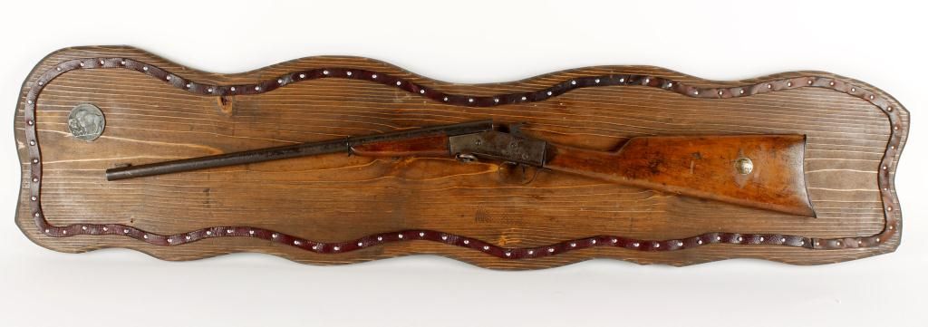 Board measures 41"Lx9 1/2"W, gun measures 32 3/4"L, includes a buffalo 5 cent medallion, rifle also has a 5 cent coin imbedded in rifle. Great decorator.