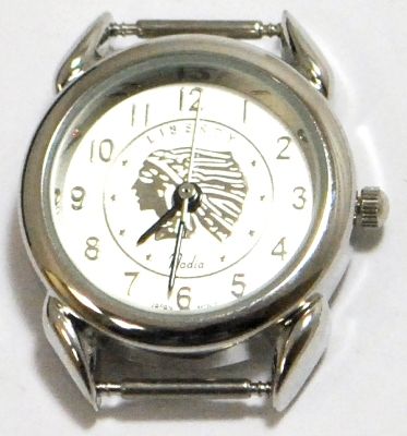 Overall measures 1-1/4" tall by 1-1/8" wide. Circular face diameter is 3/4". Wristband pins measure 1/2".