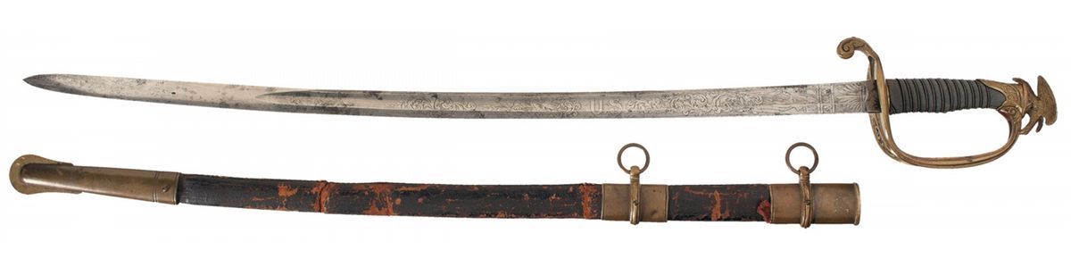 Condition: Good. Light age spotting and the blade has scattered discoloring with some minor pitting near the tip. There are several dings on the edge and a small amount of rust on the ricasso. The acid etching is clear and most of the frosted background remains intact. The scabbard has a leather body with brass drag and suspension bards. The hilt has an attractive, un-touched patina with strong traces of the original gilt finish. The grip and wire wrap are in very good condition. The leather scabbard is in poor condition with several breaks in the leather body.