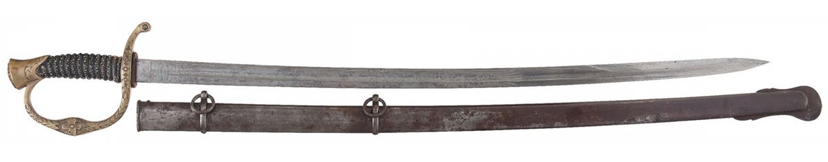 Condition: Good. The blad is near excellent with sharp etching. The brass has a dark patina, with bright spots on the high points of the grip section. The scabbard is good, with a brown patina overall, scattered spotting, and mild handling marks.