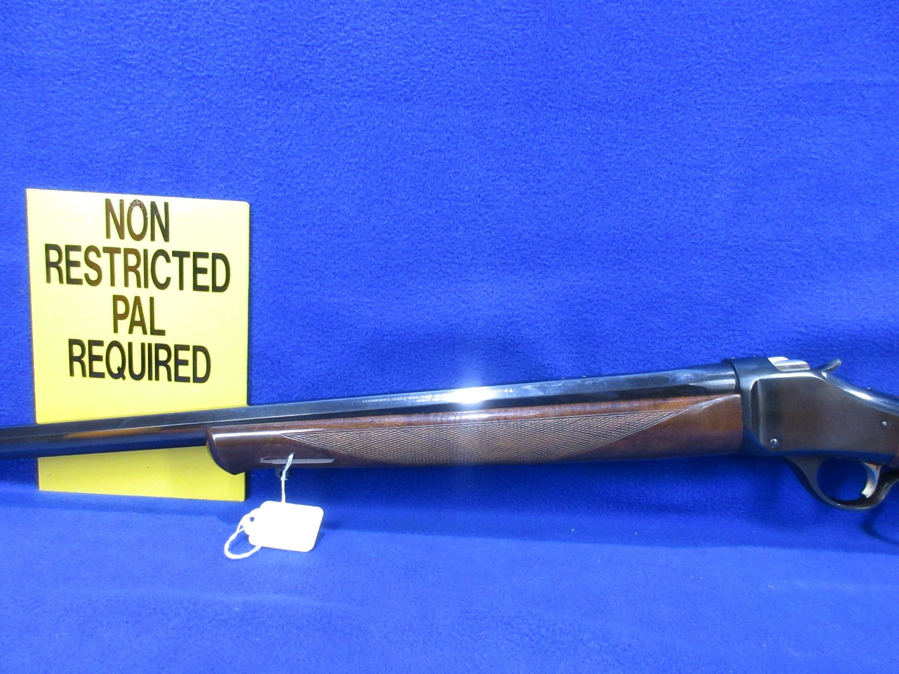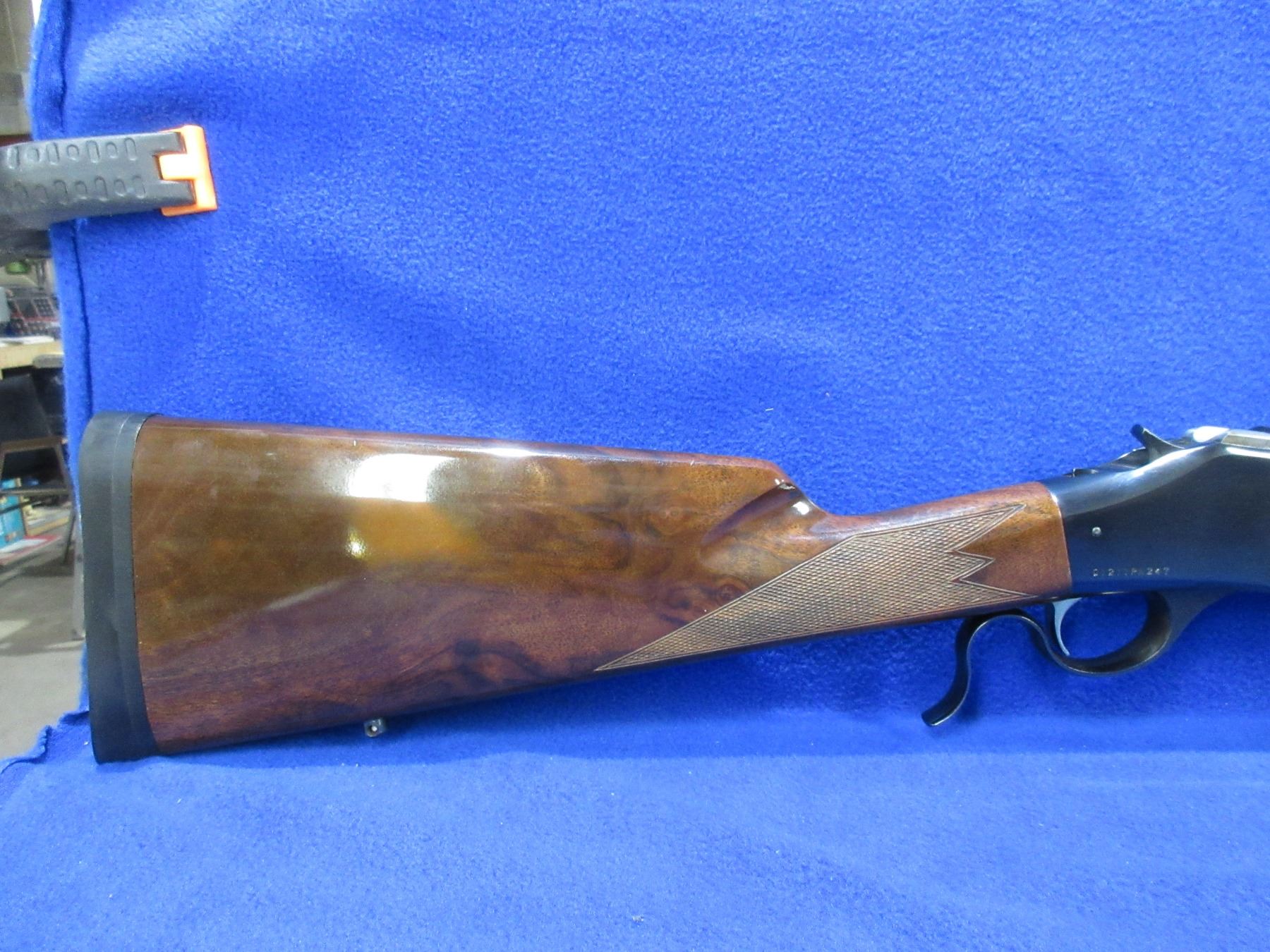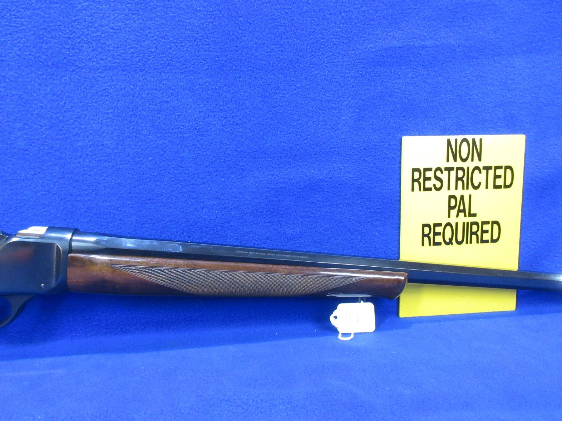 Non-Restricted - Browning Model 1885 High Wall in 270 Win. - This single shot falling block rifle appears to be in very good working order. Octagon barrel is 28", rifling is very good, bluing is very good, has no sights but is drilled and tapped, stock and forearm are good to very good with a few handling marks, rubber butt plate very good. Ser # 01211PN247