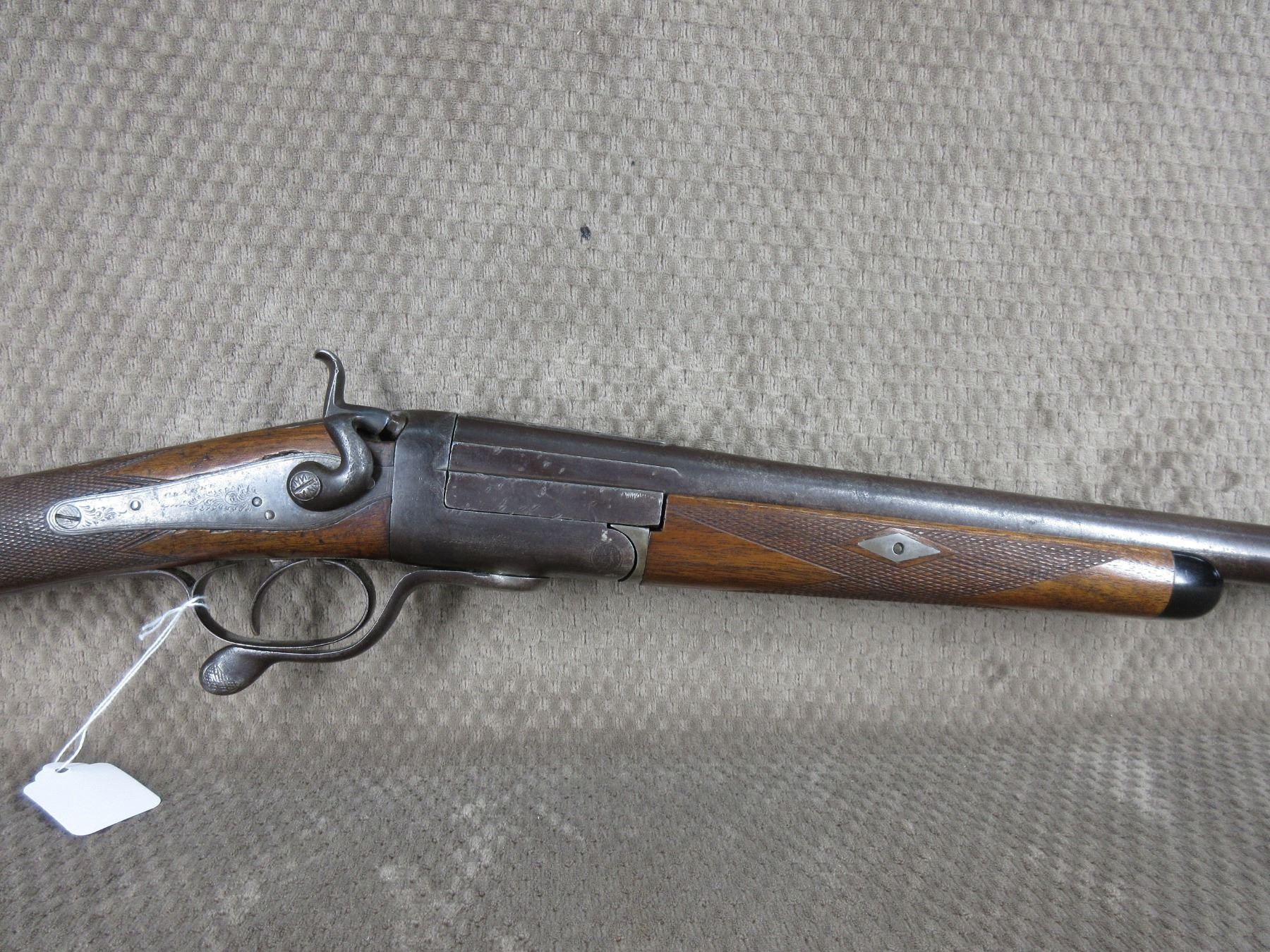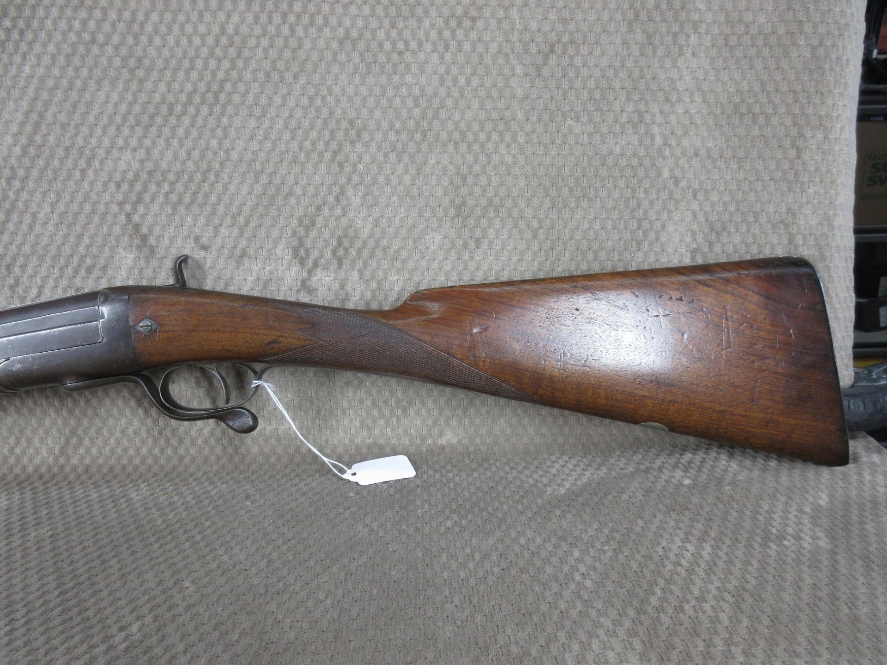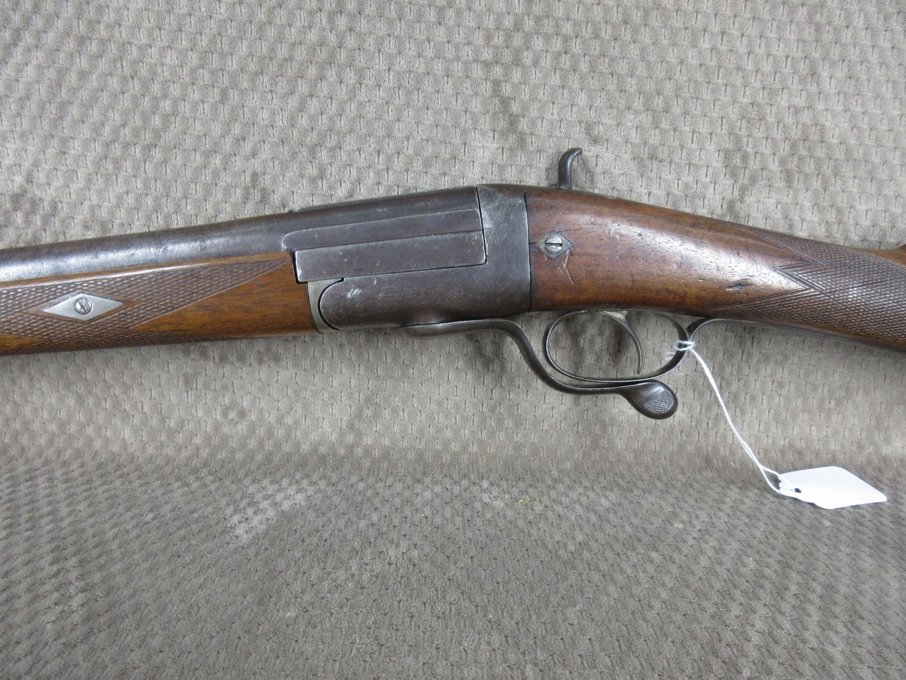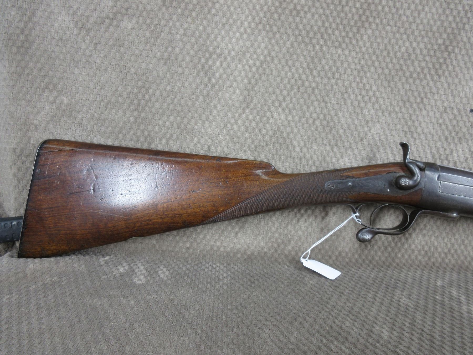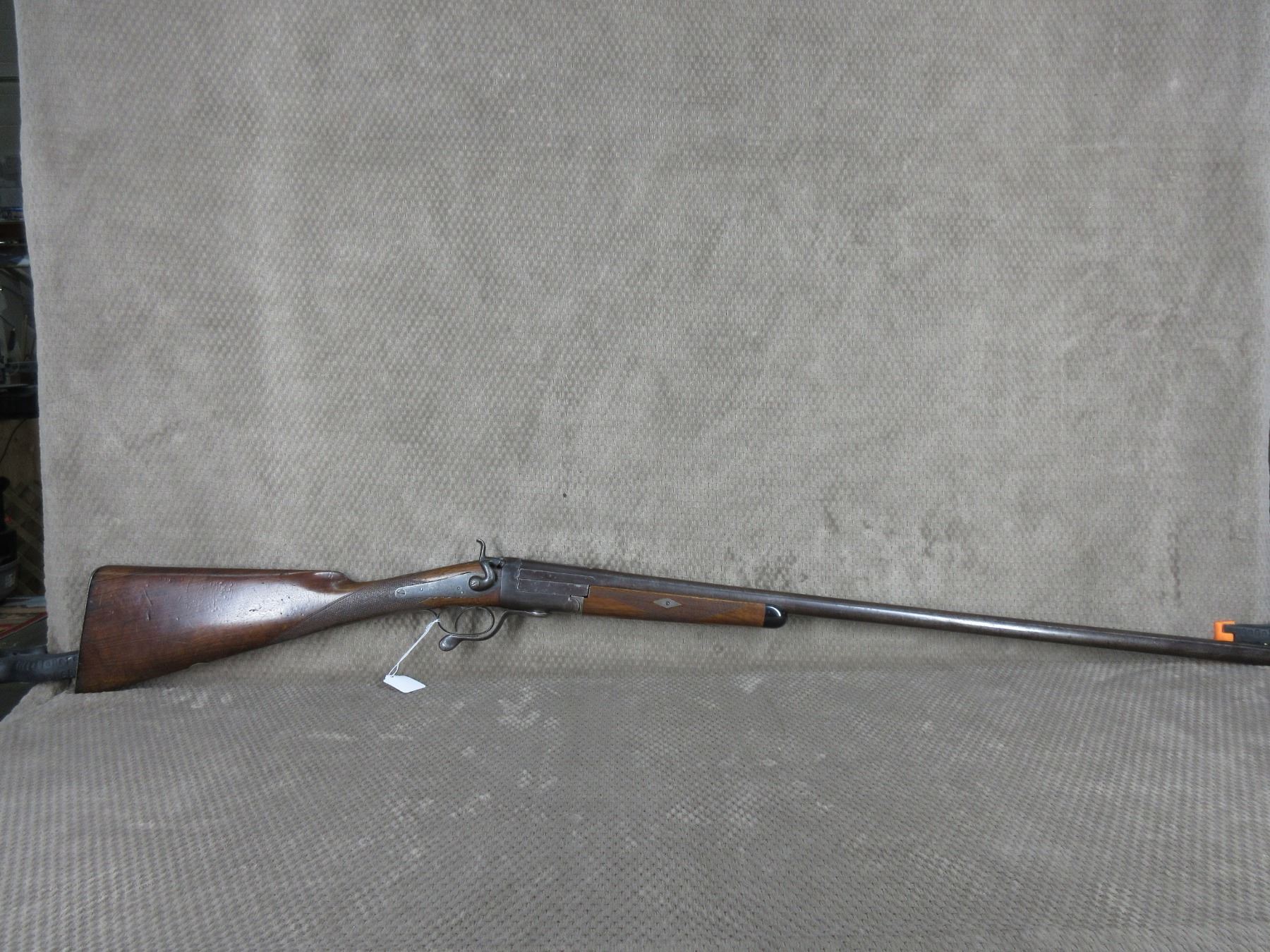 Non-Restricted - Clarke (English?) Under Lever in 12 ga - This single shot shotgun appears to be in working order (action tight when closed) and appears to be a 30 inch Damascus barrel. Browning has wear and light pitting, bore is good, has front sight, wood is in good condition for its age.