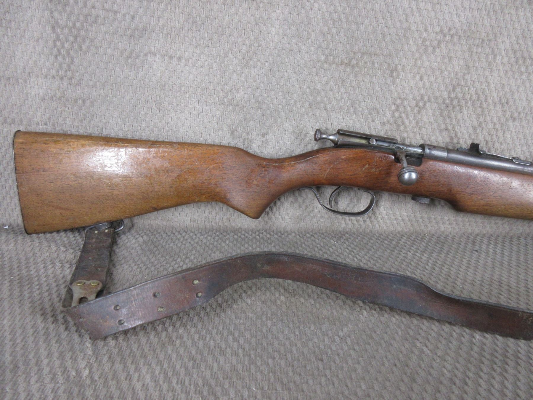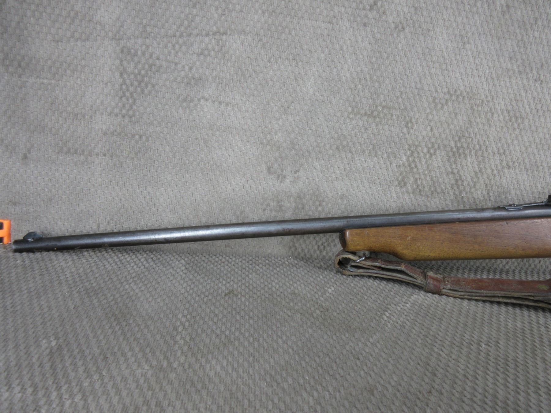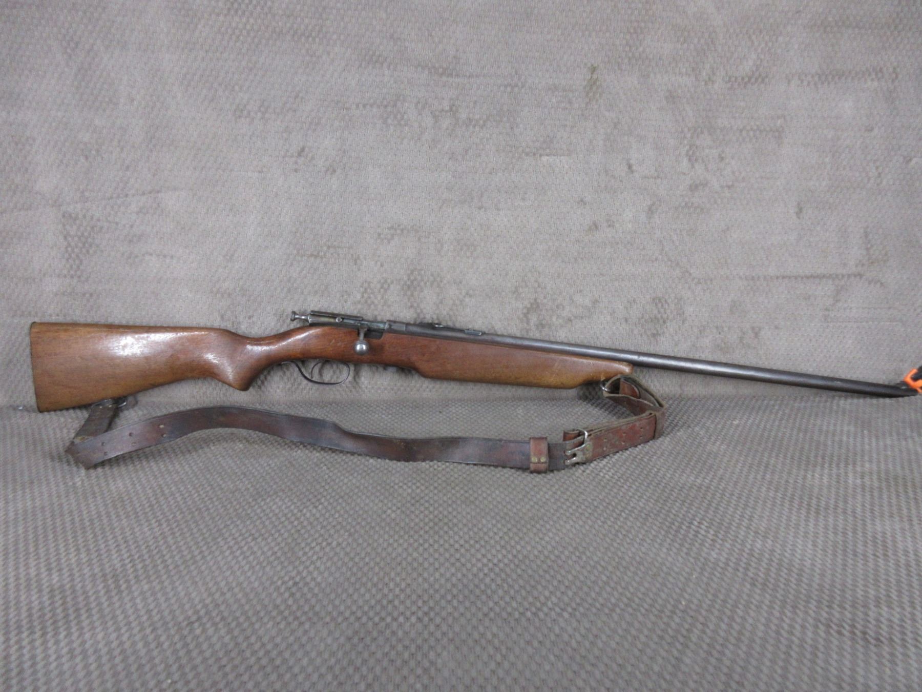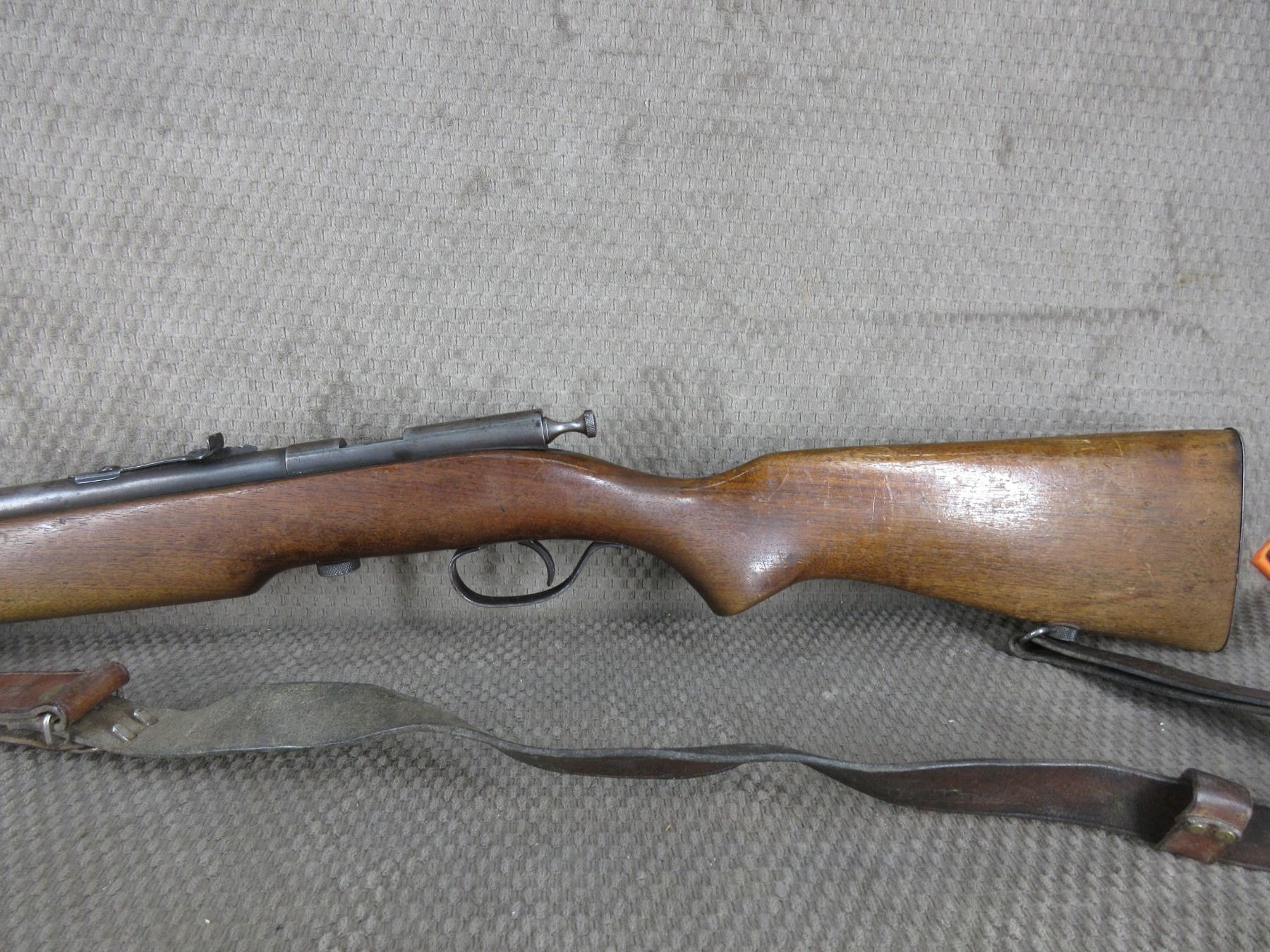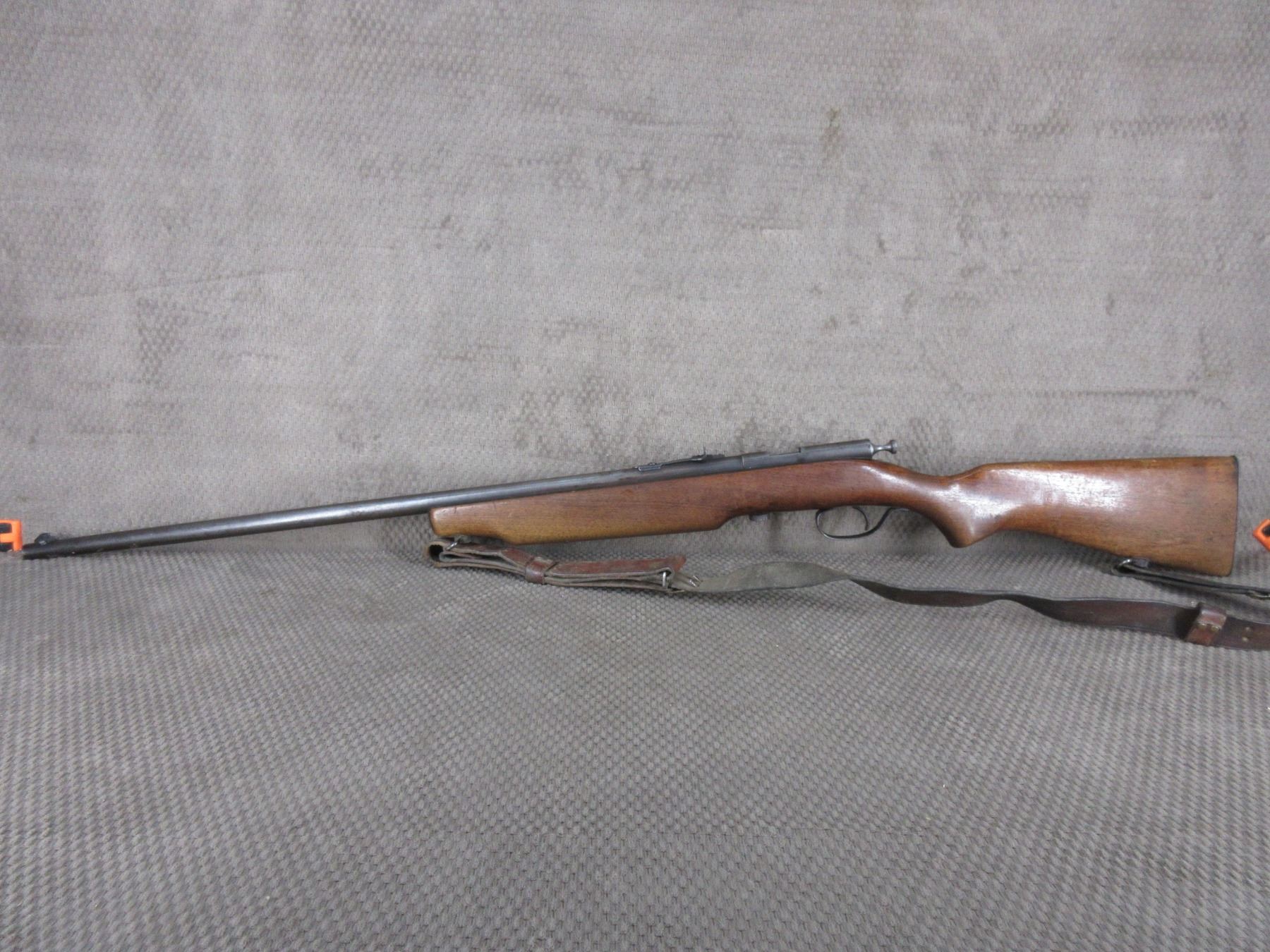 Non-Restricted - Cooey Sureshot in 22 Long Rifle - This single shot bolt action rifle appears to be in good working. Barrel is 27", bore is very good, bluing mostly gone, has both sights, stock is good with normal marks but finish is flaking off, metal butt plate.