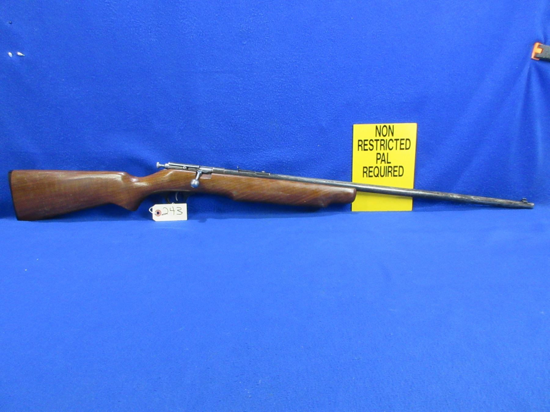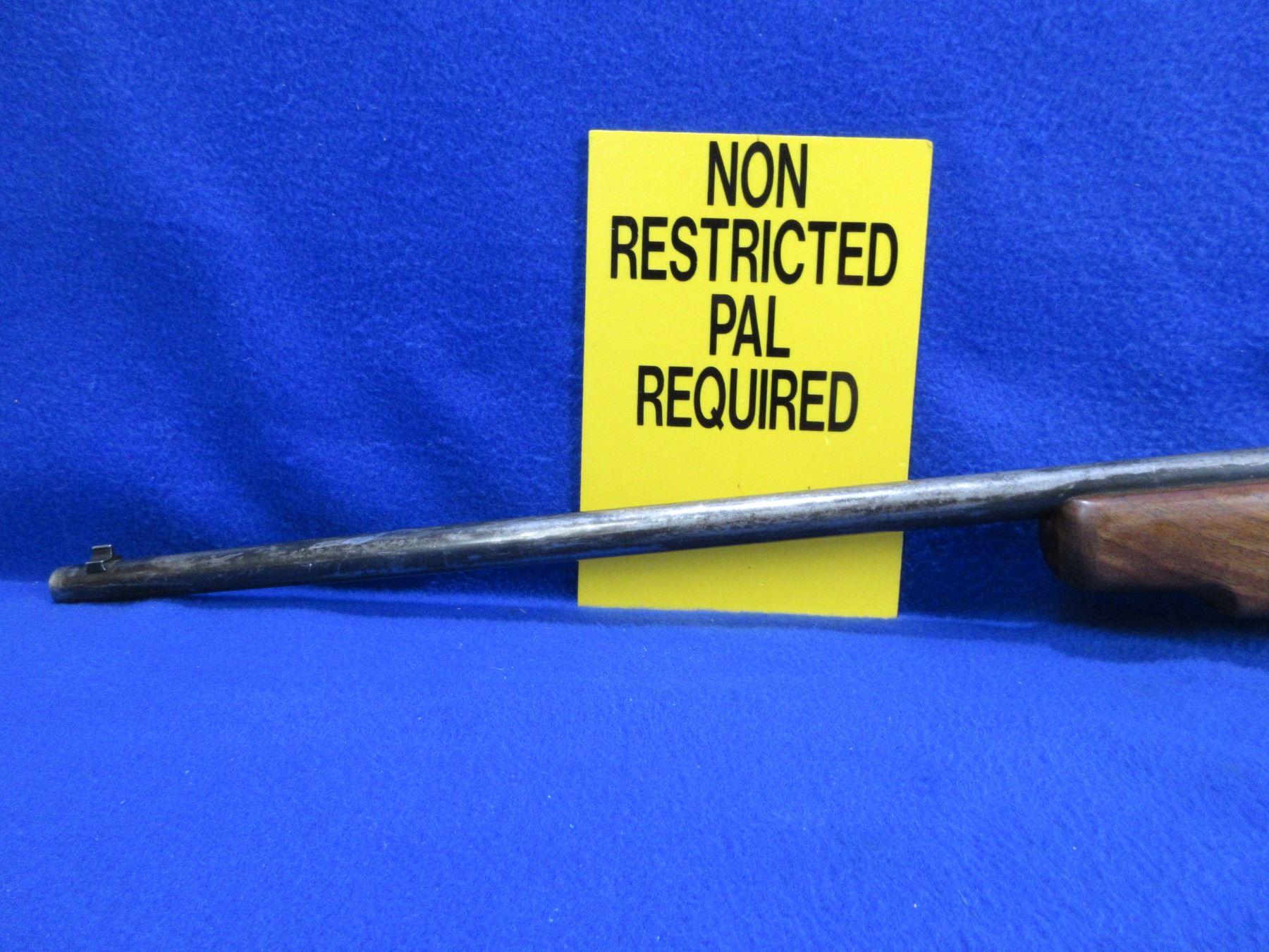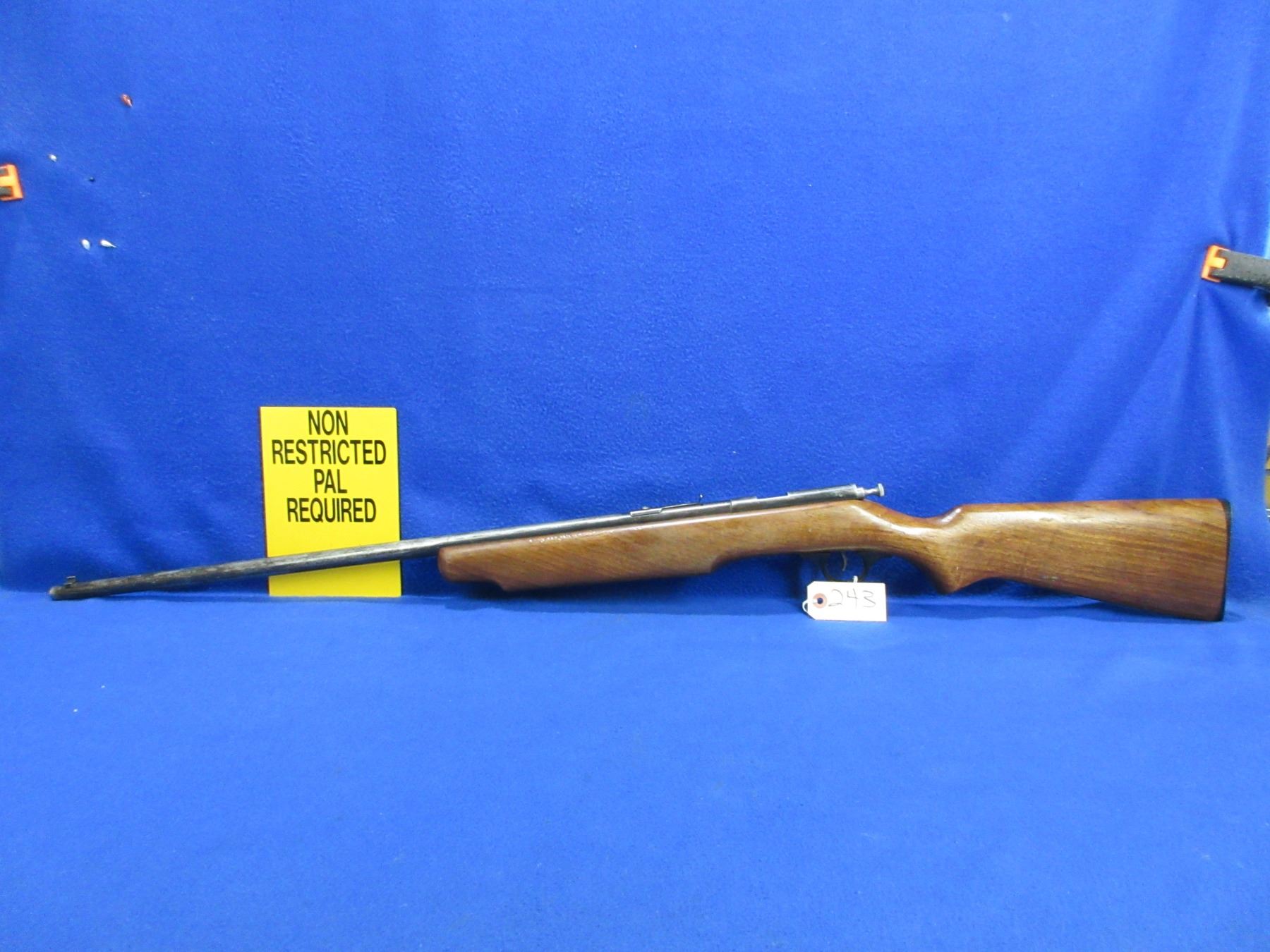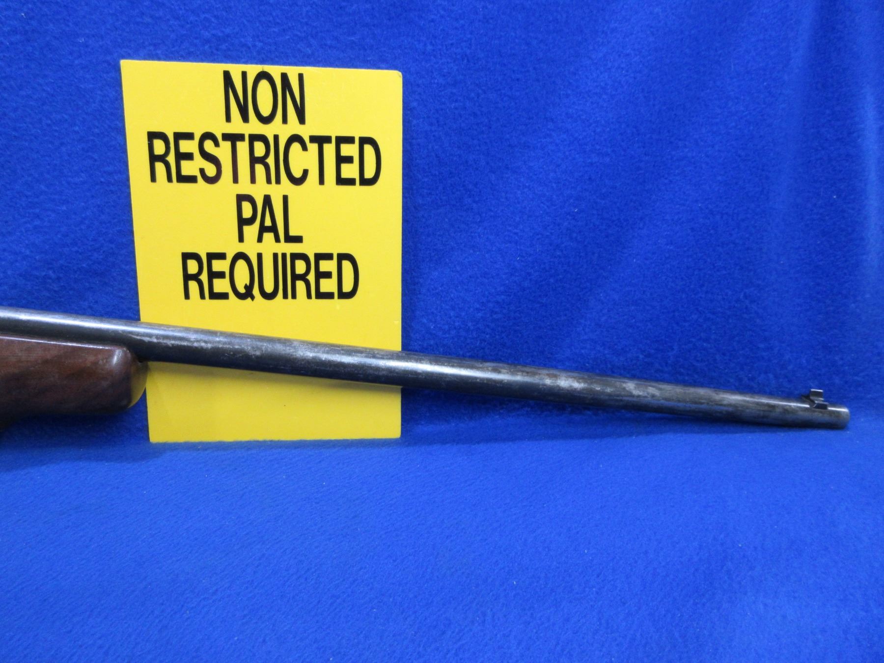 Non-Restricted - Cooey by Winchester Model 75 in 22 S/L/LR - This single shot bolt action rifle appears to be in good working order. Barrel is 27", rifling is good to very good, bluing is mostly gone, has both sights but rear ramp is missing, stock is good to very good with usage marks, butt plate good. Ser # None