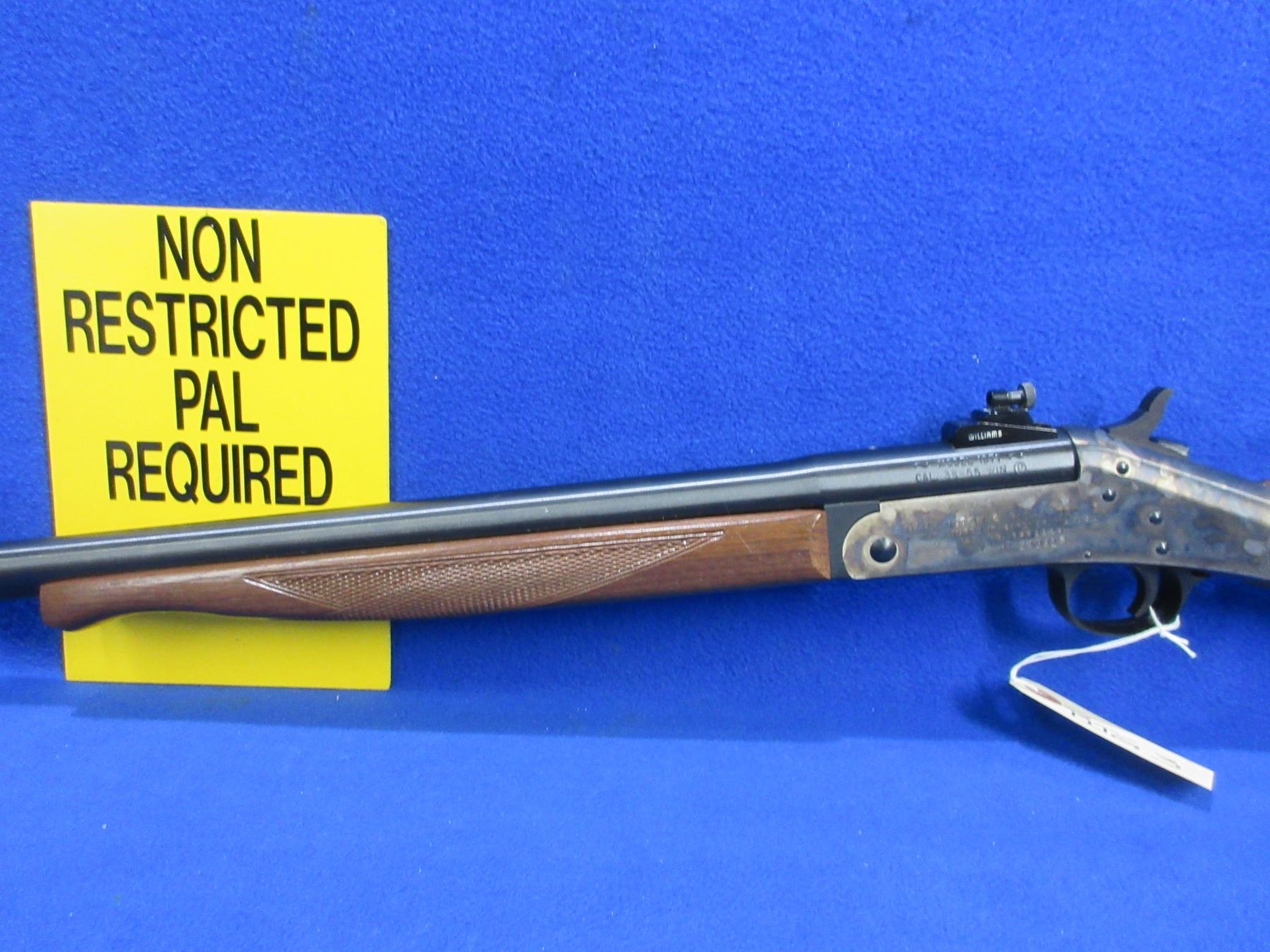 Non-Restricted - Harrington & Richardson 1871 in 38-55 Win - This single shot tip up rifle appears to be in very good working order. Bull barrel is 28", case hardened action very good, rifling is very good, bluing is very good, has front peep sight and Williams rear peep sight, stock and forearm are very good, case hardened metal butt plate very good. Ser # HT243517