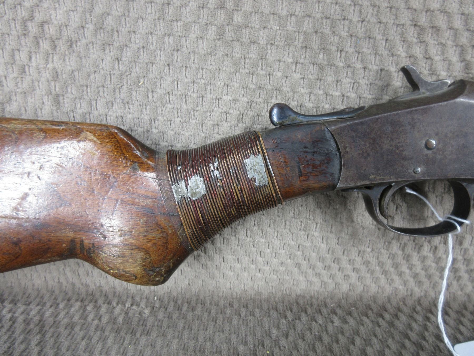 Non-Restricted - Harrington & Richardson Single Shot in 410 - This single shot shotgun appears to be in working condition. Barrel is 26", bore is shiny, bluing is turning grey with pitting, front bead, stock cracked with copper wire wrap on wrist, forearm is missing a piece, butt plate good.