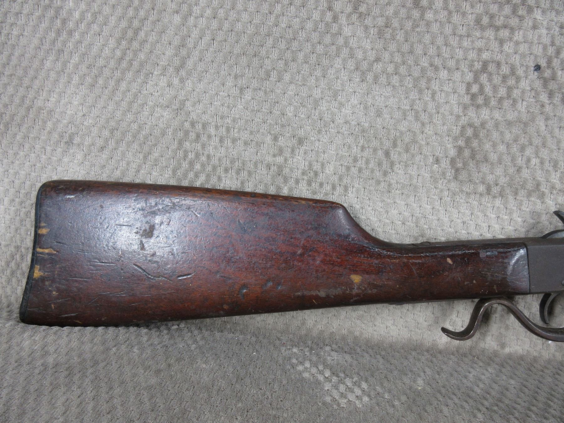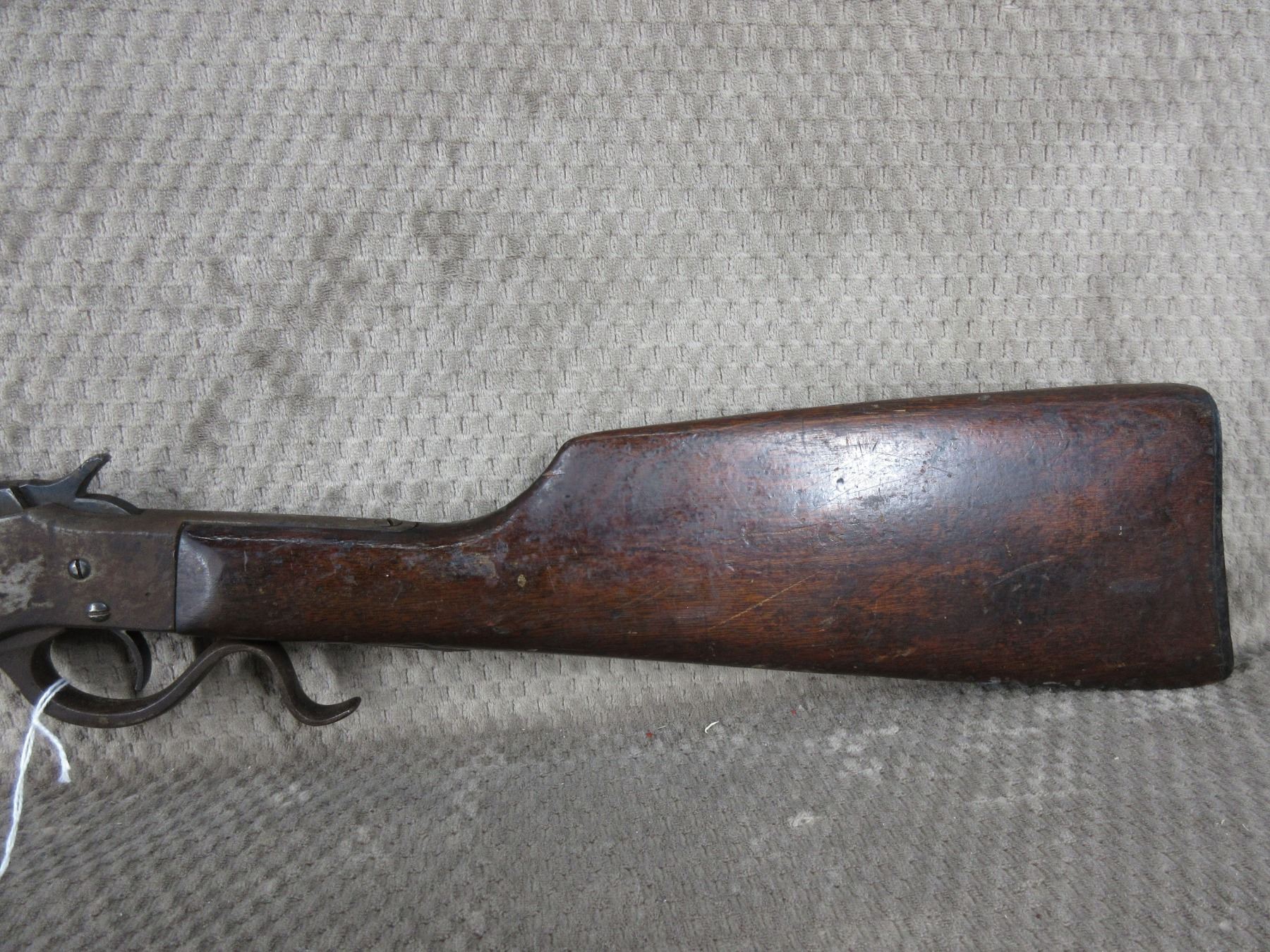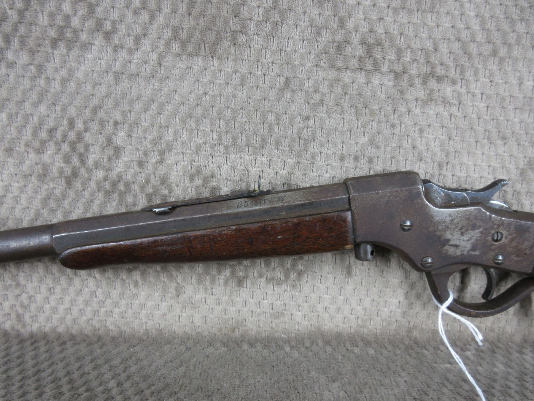 Non-Restricted - J. Stevens Lever Action in 25 Stevens - This single shot rifle appears in fair working order as it holds cock, rifling is visable 50% bluing mostly gone or rusted, stock has usual cracks in wrist, forearm not cracked, butt plate poor, missing front sight.