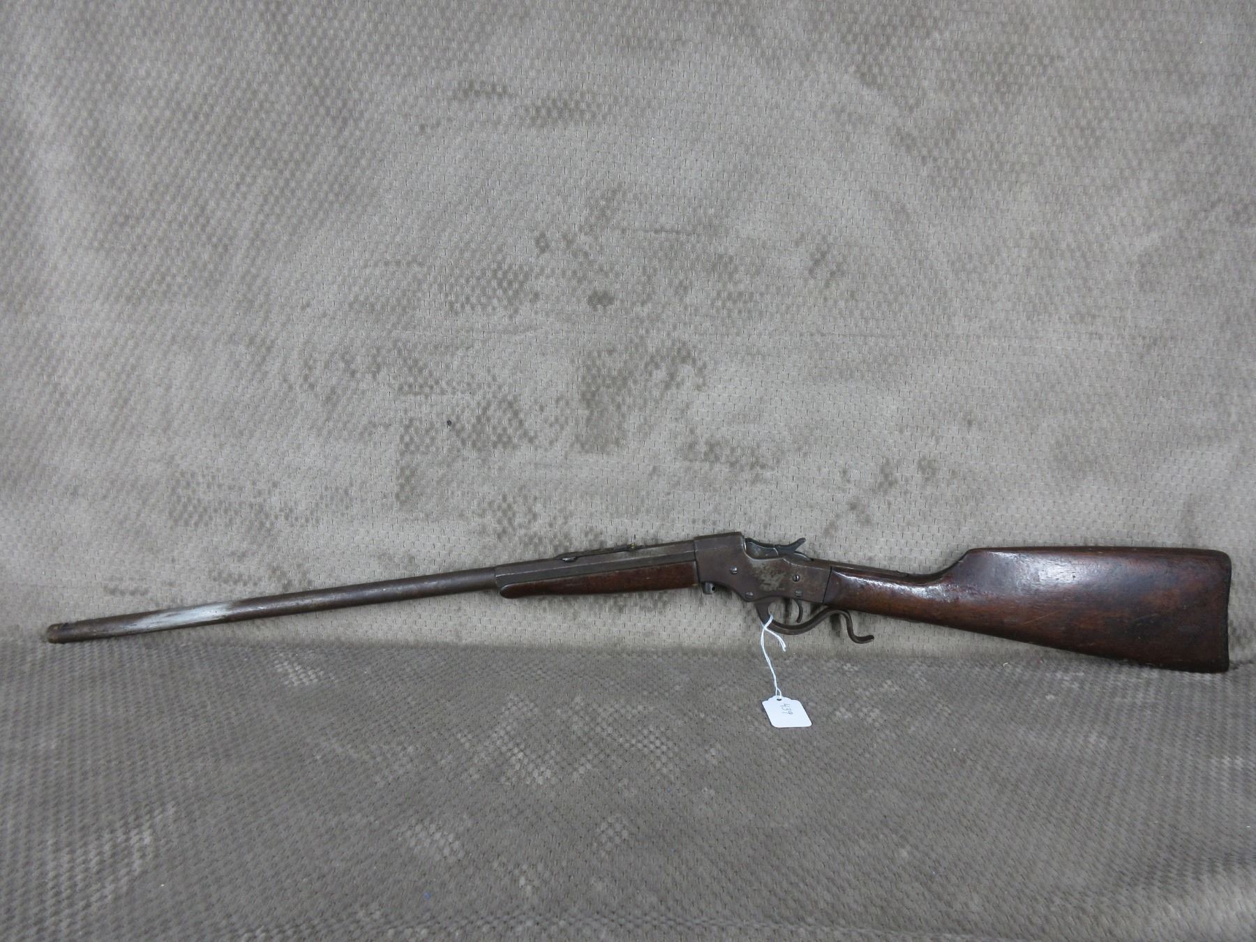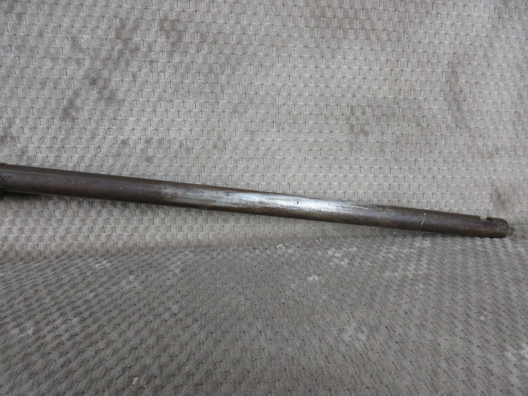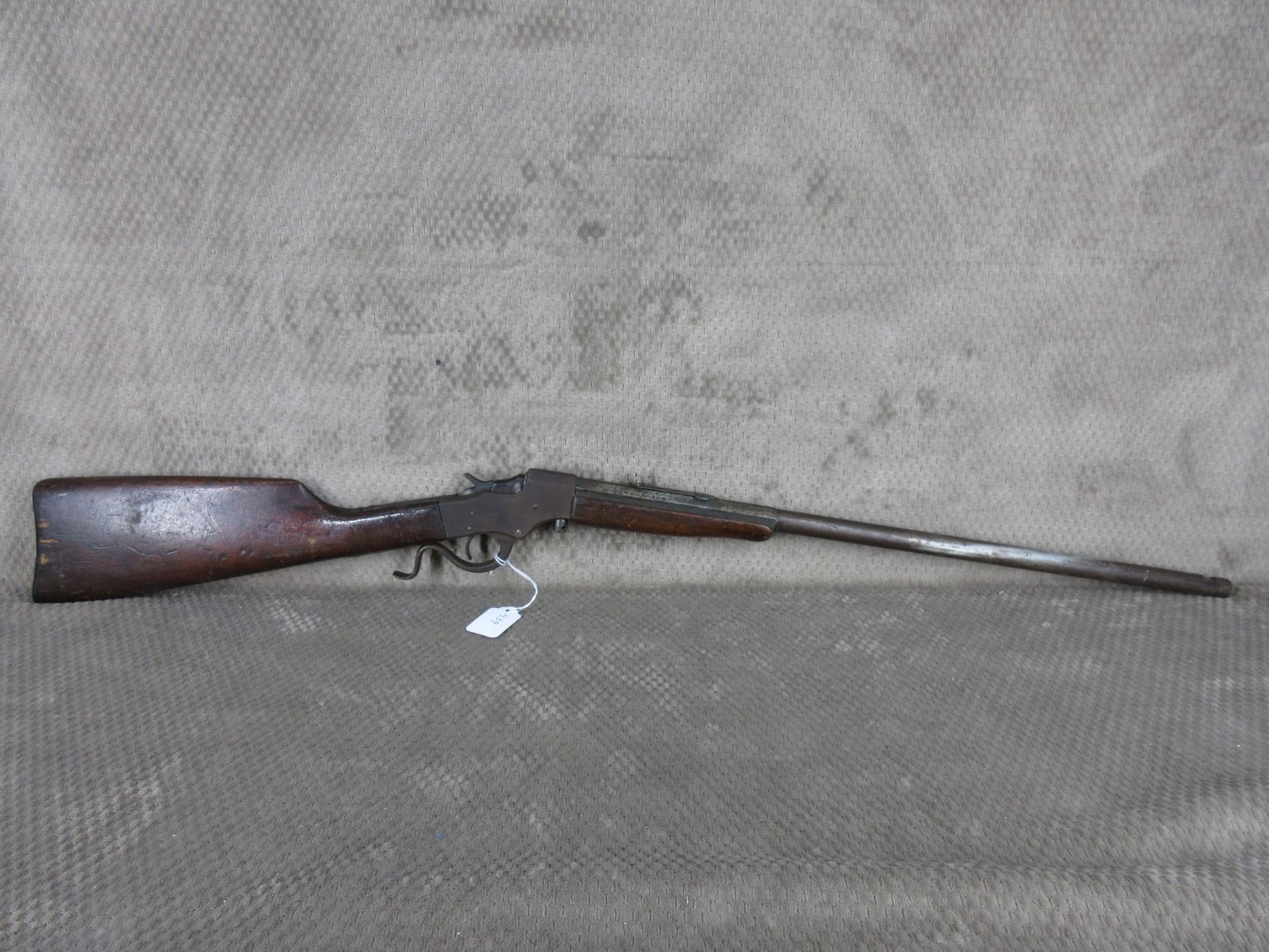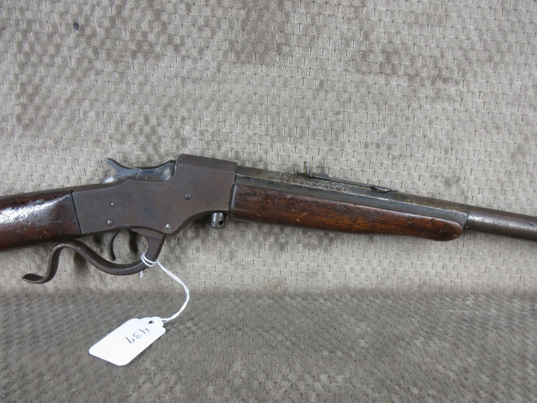 Non-Restricted - J. Stevens Lever Action in 25 Stevens - This single shot rifle appears in fair working order as it holds cock, rifling is visable 50% bluing mostly gone or rusted, stock has usual cracks in wrist, forearm not cracked, butt plate poor, missing front sight.