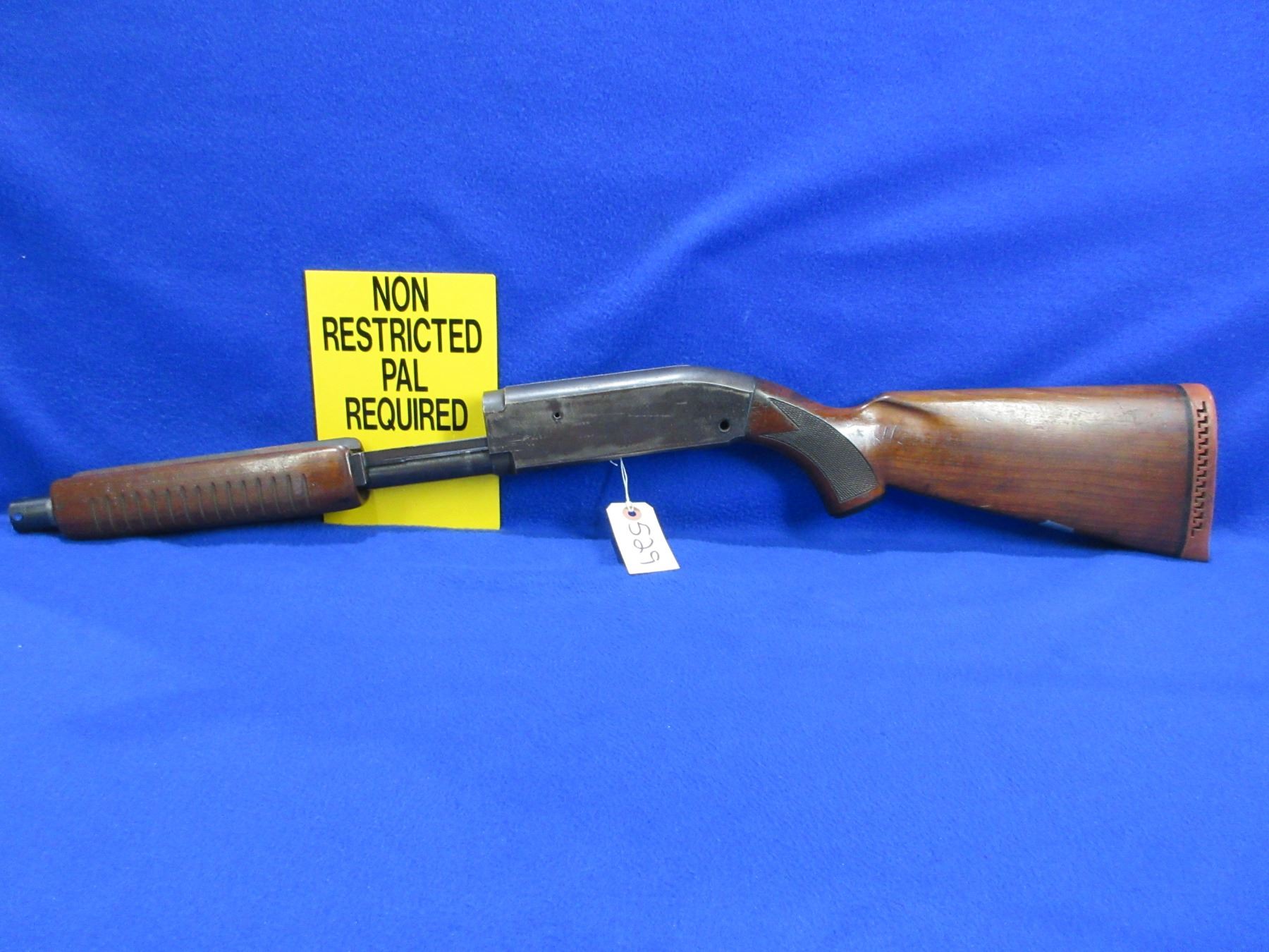 Non-Restricted - JC Higgins Action and Stock in 12 Ga. - This pump action shotgun is stock, action and forearm only. Stock is good to very good with usage marks, forearm has a full length crack on barrel bed, bluing on action mostly gone with light pitting, rubber recoil pad good. Ser # None