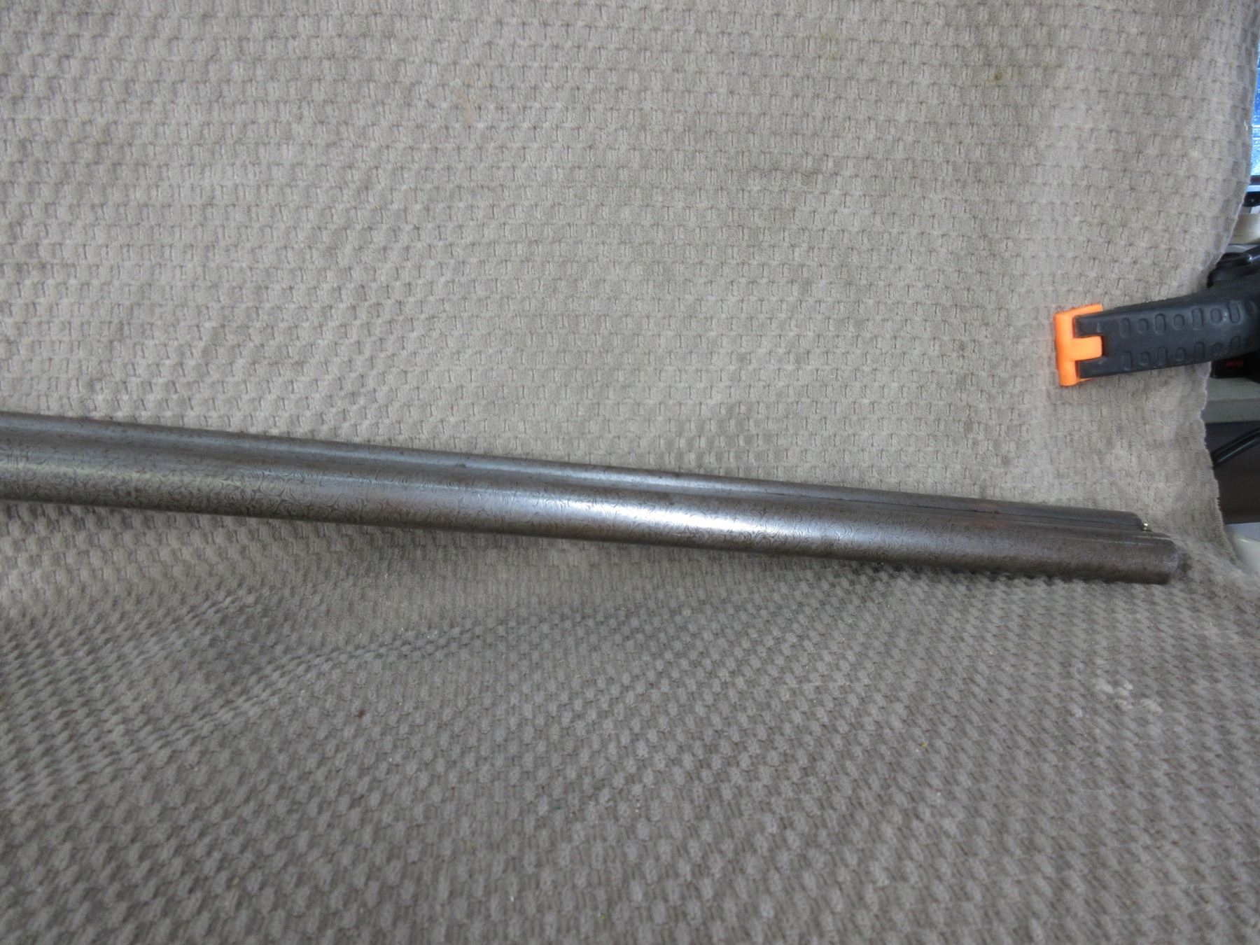 Non-Restricted - Joseph Lang Side by Side in 12 Gauge - This side by side, under lever, hammer shotgun with damacus barrels appears to be in good to very good working order as action is tight. Barrels are 28" and have some minor dints, bores are good but grey, bluing or browning is gone, has front bead, stock has been broken and repaired and refinished, and most of the old usage marks are still there, forearm refinished and good for age.