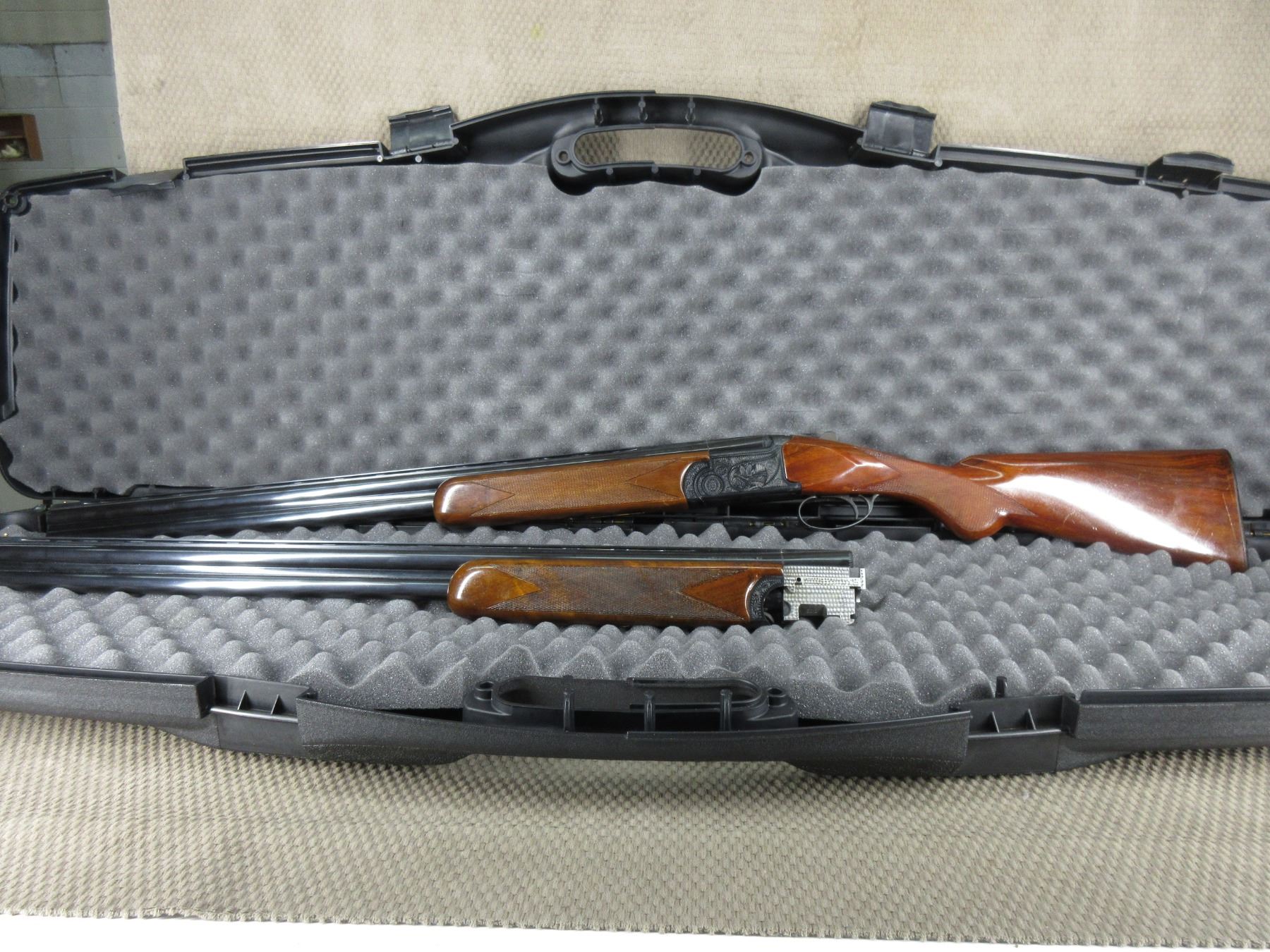 Non-Restricted - Lames Model 801 Combo in 12 GA & 20 Ga - This over and under shotgun comes with 2 sets of barrels with correct serial #'s. 1 is 12 ga 2 3/4 chambers the other is 20 ga 2 3/4" chambers and also comes with a Flambeau plastic hard case . Gun appears to be in good working order. Barrels are both 28", bores are all shiny, bluing is very good, both have front beads, stock has some light usage marks, 12 ga forearm has some dints. 20 ga forearm is very good.
