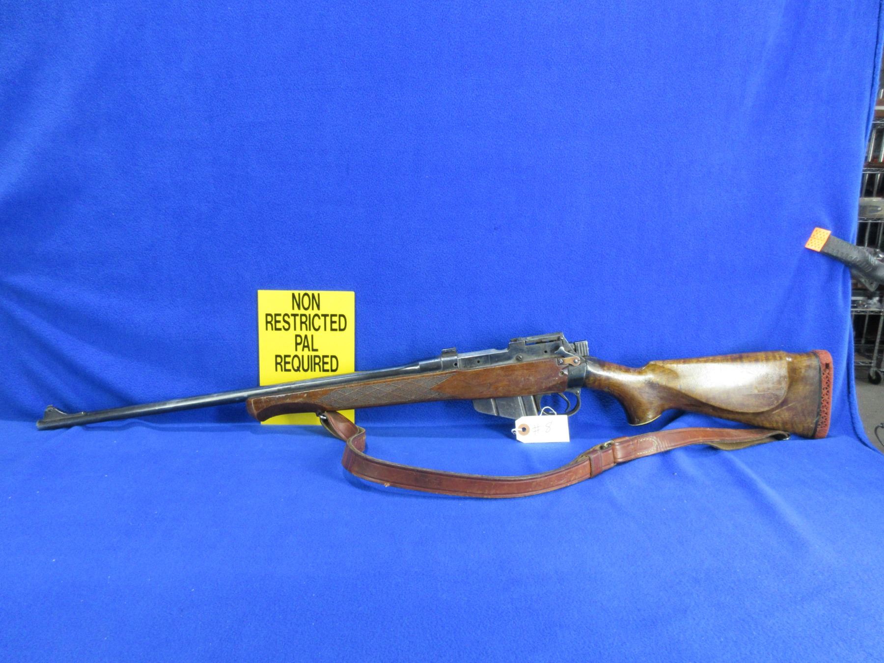 Non-Restricted - Lee Enfield in 303 British - This bolt action rifle with removable magazine appears to be in good working order. Barrel is 22", rifling is good to very good, bluing is fair to good, has a front sight and a Parker Hale rear sight missing the peep hole, also is drilled and tapped with a Weaver base, stock is fair to good as it has 2 chip repairs at the receiver, rubber recoil pad is poor. Stamping is hard to read on the left side of action (appears to be a No. 4 Mark I but we are unsure). Serial number has been taken off of left side of the barrel by the action. Comes with swivels and a leather sling. Ser # M/47C