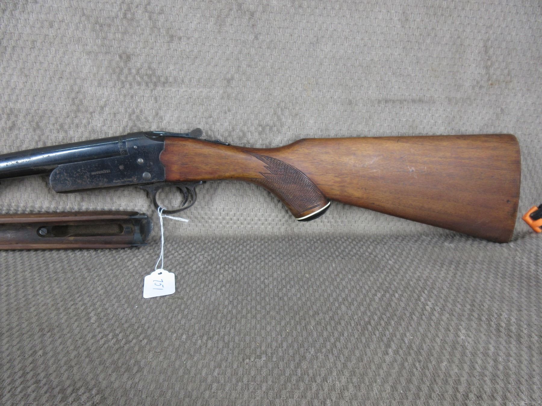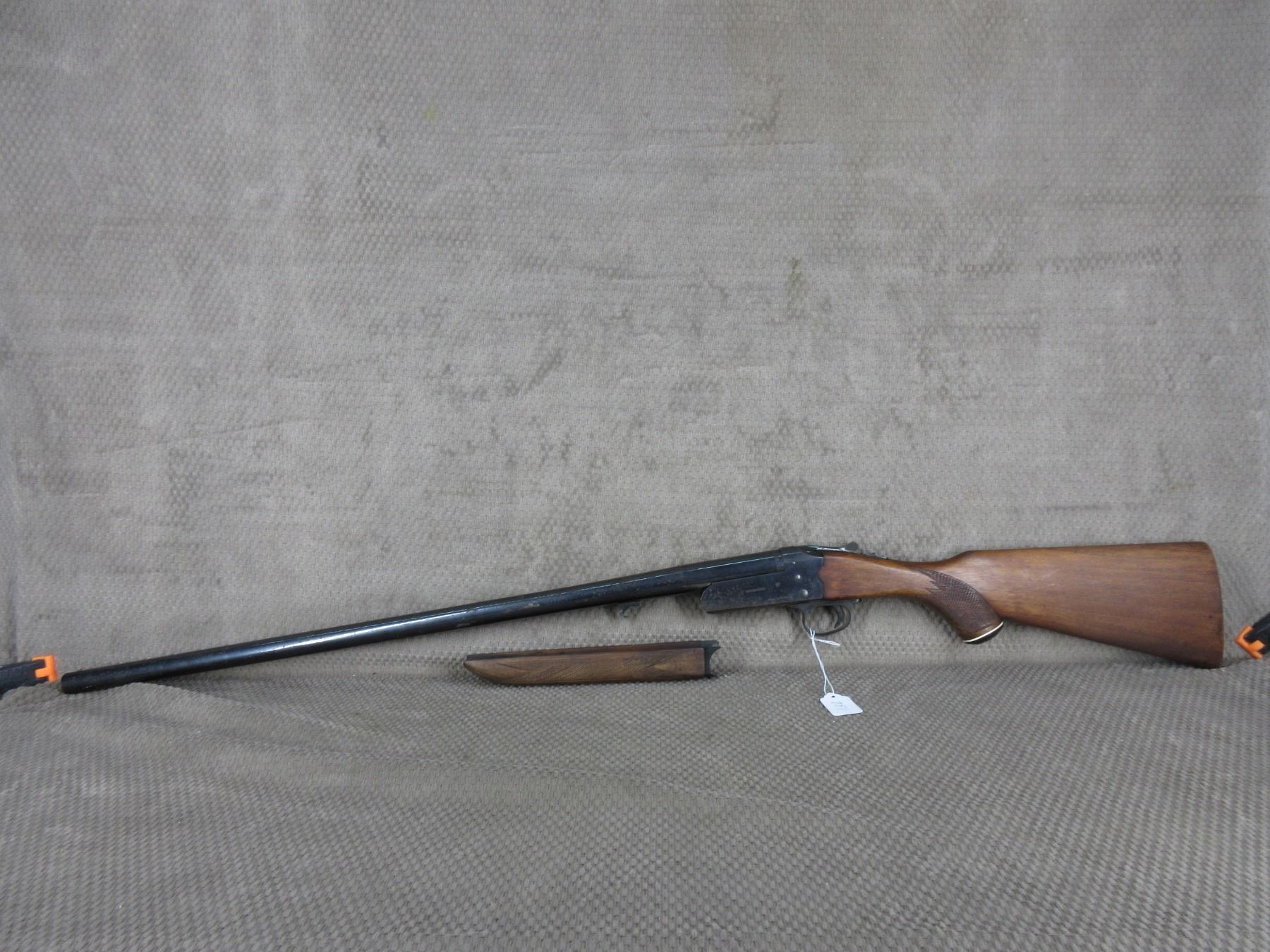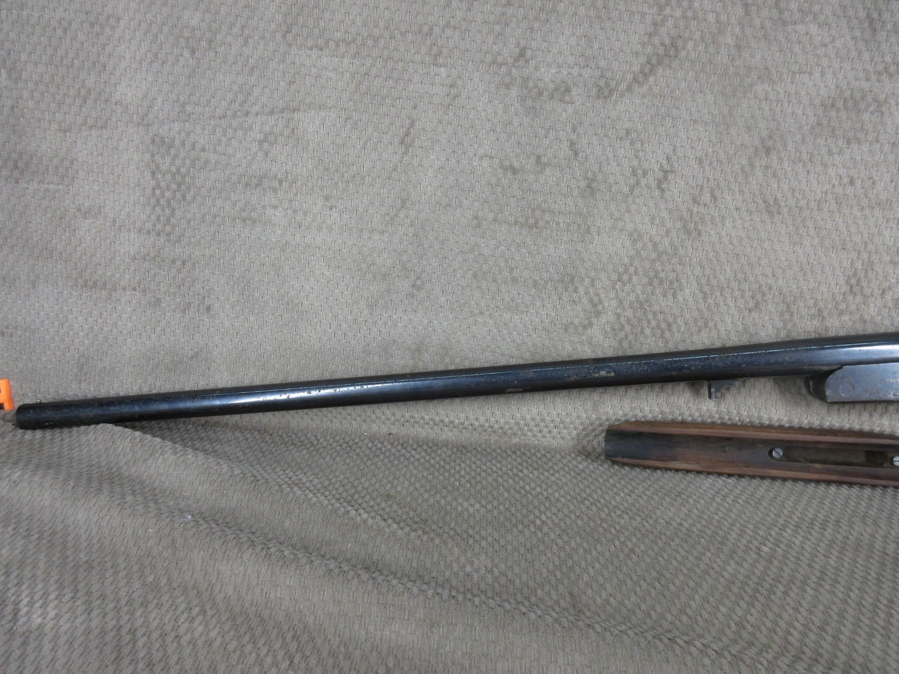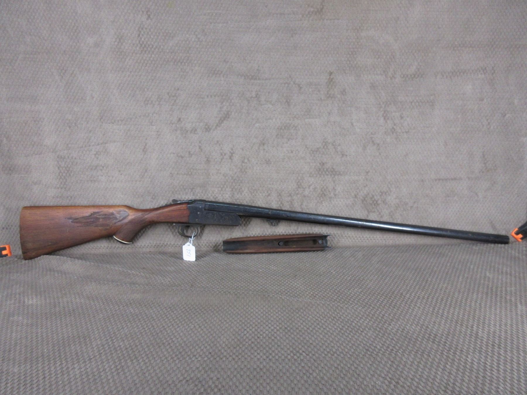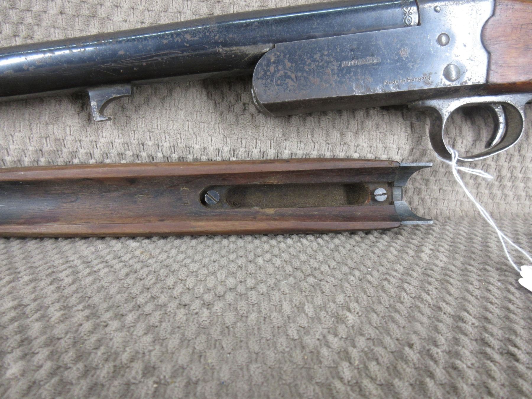 Non-Restricted - Made in Hungary in 12 Gauge - This single shot break action with ejector hammerless shotgun appears to be in non-working order as it is missing forearm attachement parts. Barrel is 28", bore shiny, blueing is pitted, front bead, stock is cracked at wrist and has a large gouge that someone tried to repair, forearm good but missing parts, no butt plate.