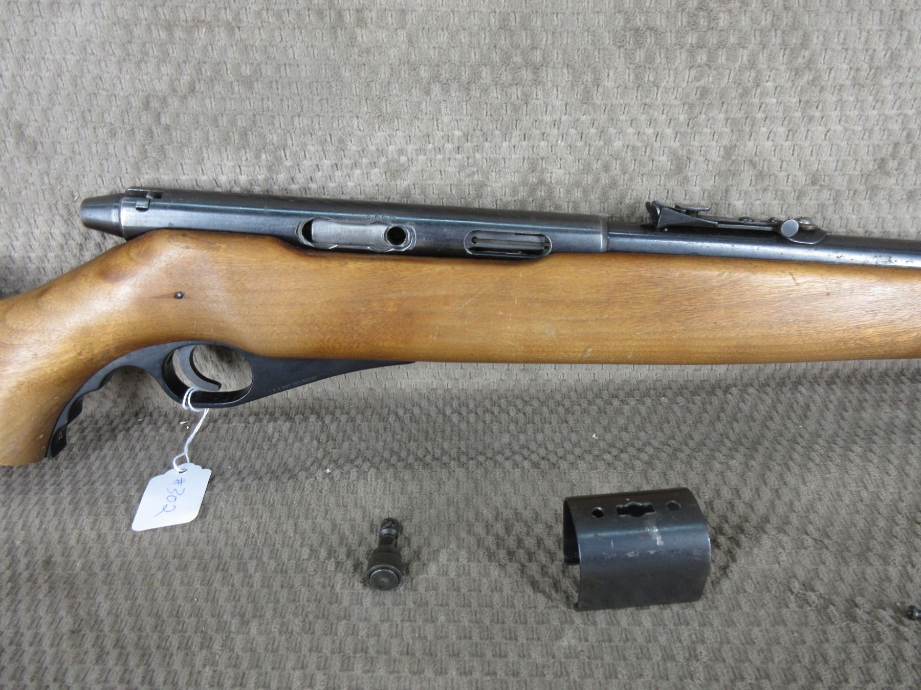 Non-Restricted - Mossberg Model 51M(a) in 22 LR - This semi-auto rifle appears to not be working order, cocking lever does not stay in bolt, bolt can be moved back and cocks trigger. Has both sights, barrel is 20", rifling appears good but ringed about 6" from end of barrel, bluing is fading in patches, front wood appears to have been hand made but not finished, band that goes between stock and forearm is included, metal butt plate.
