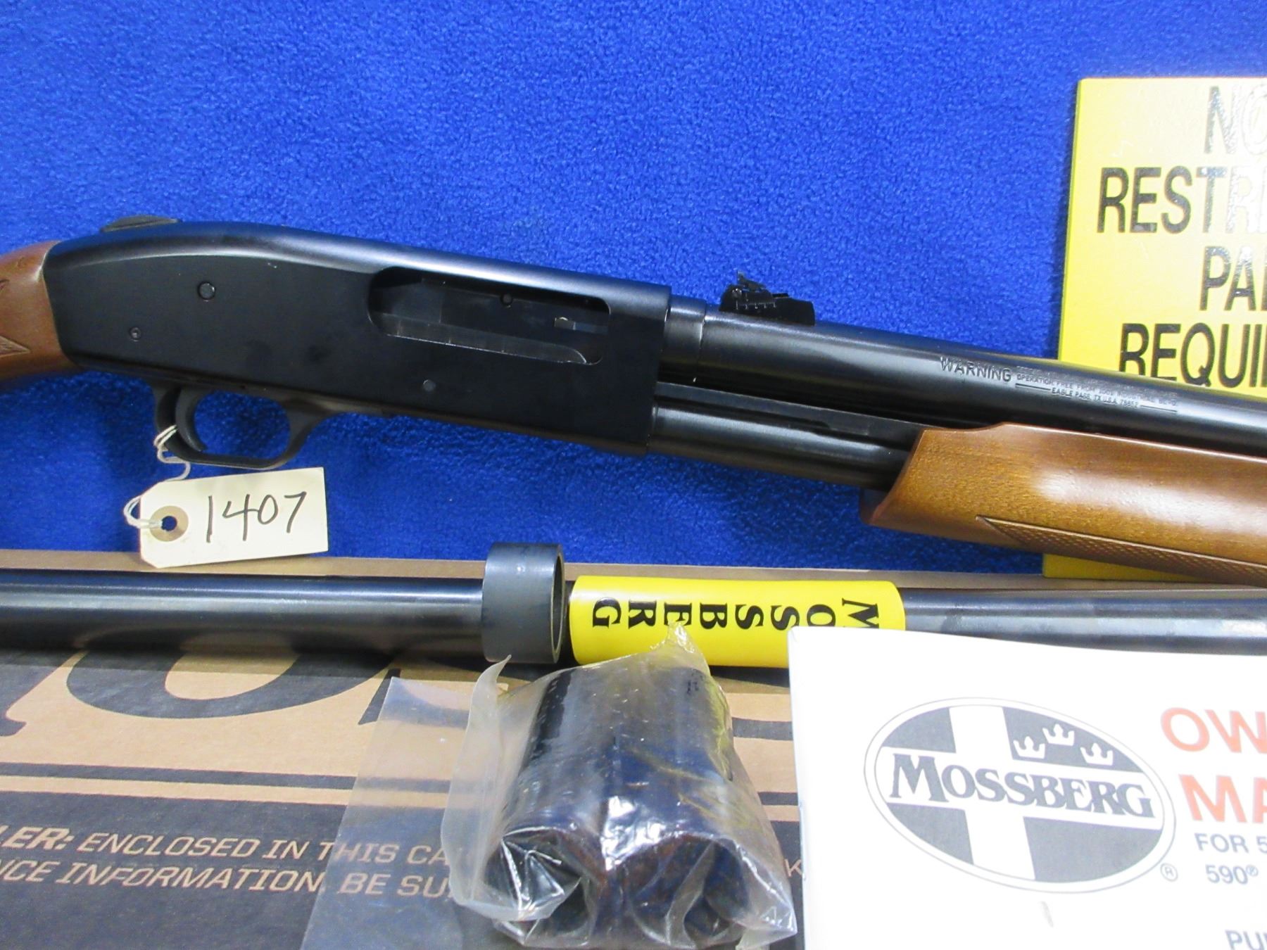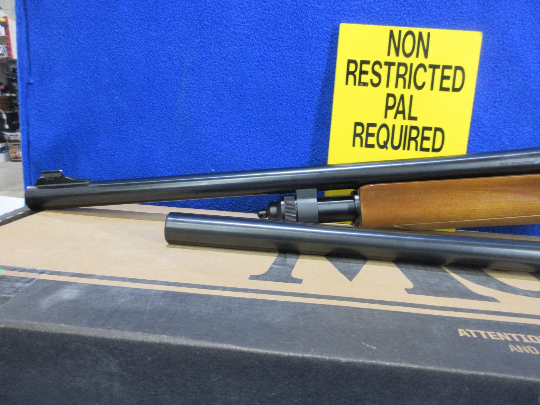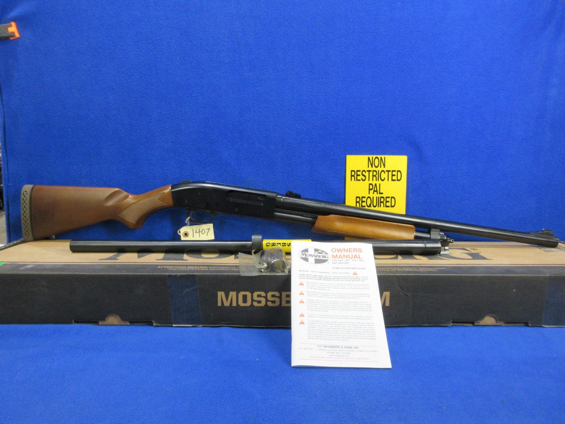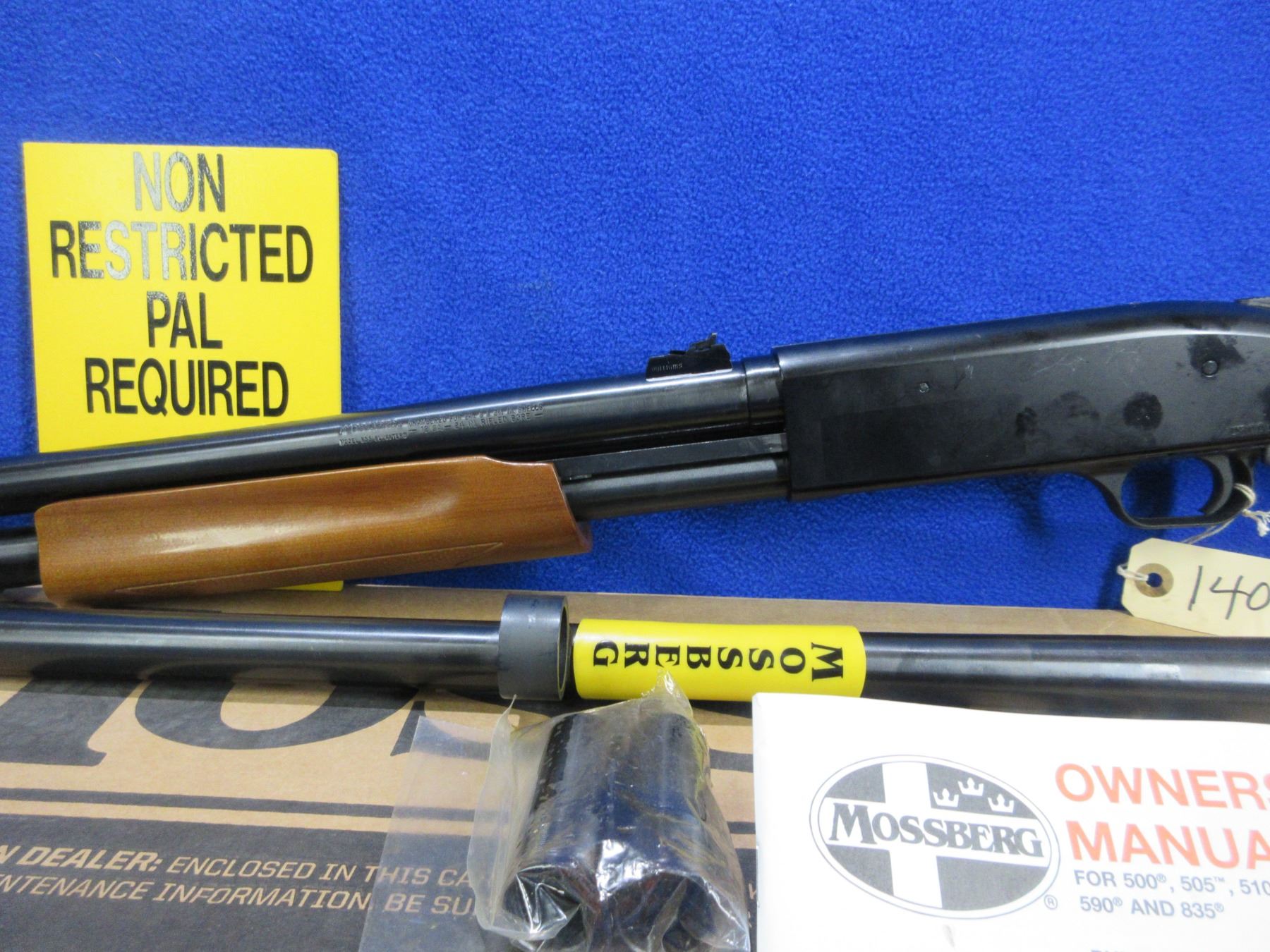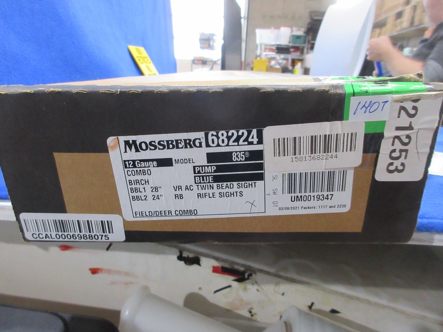 Non-Restricted - Mossberg Model 835 in 12 Ga. 3 1/2" - This is a Like New pump action shotgun with tube magazine and 2 barrels. 24" rifled slug barrel with both sights and a 28" vent rib barrel with removable chokes and bead front sight. action is stiff (still new) and appears to be in very good working order. Bore is very good, bluing is very good, has bead front sight, stock is very good, forearm is very good, length of pull is 14", rubber recoil pad very good. Comes with original box, paperwork, 2 extra chokes and wrench. Ser # UM0019347