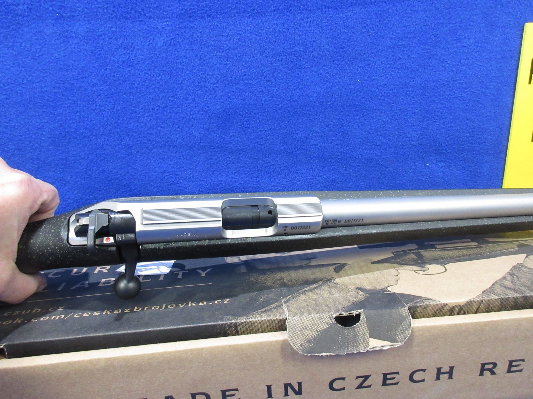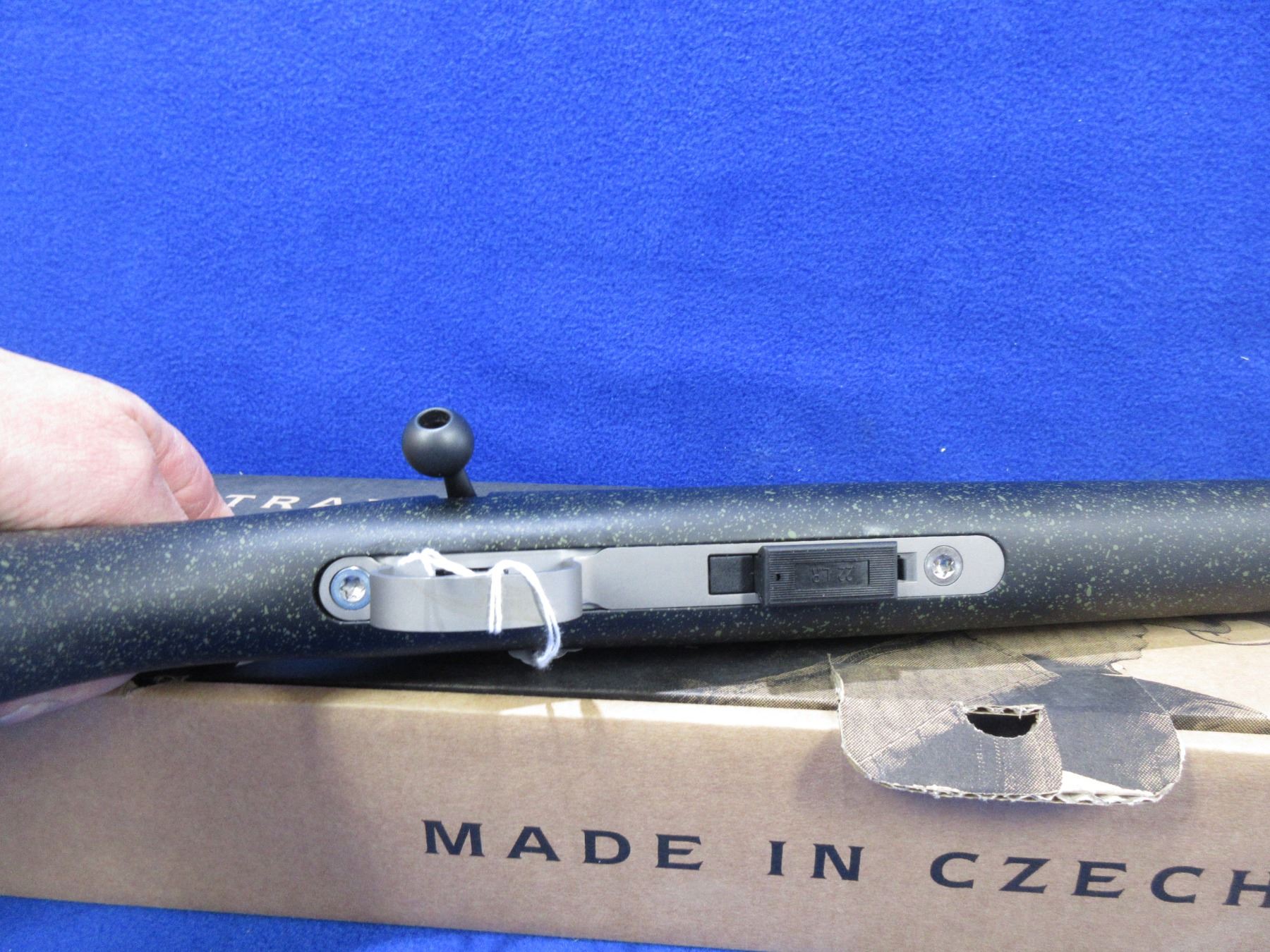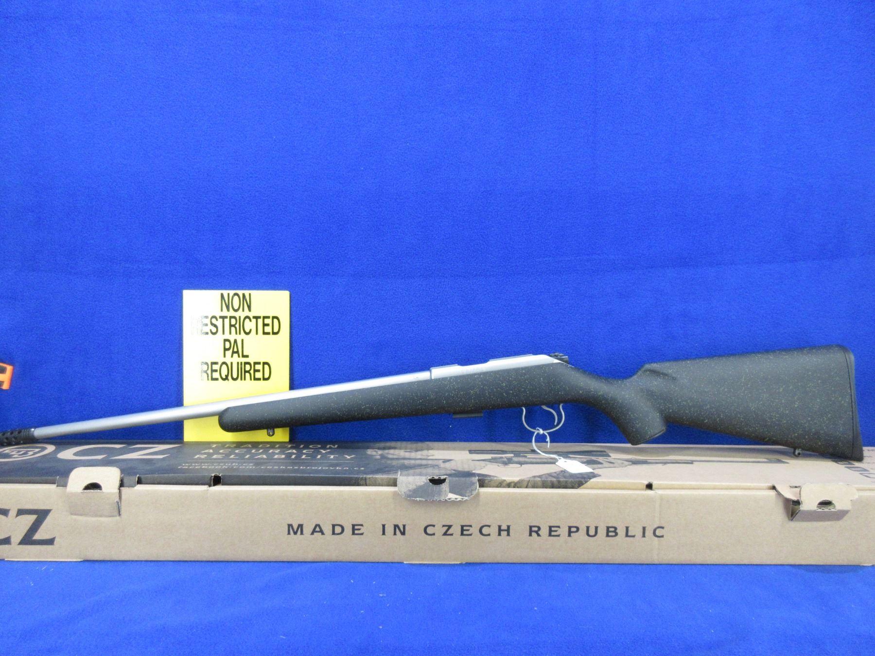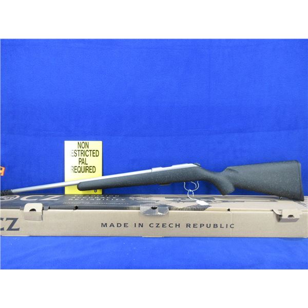 Non-Restricted - NEW CZ 455 Stainless in 22 LR - This new bolt action rifle with 5 shot magazine, black painted wood stock with speckled green spots, 20 3/4" barrel, muzzle break and no sights, Ser # D011321