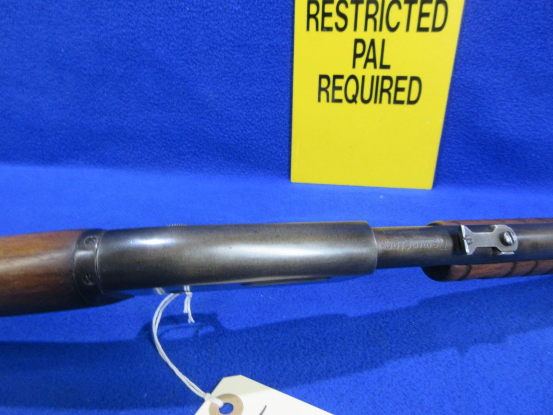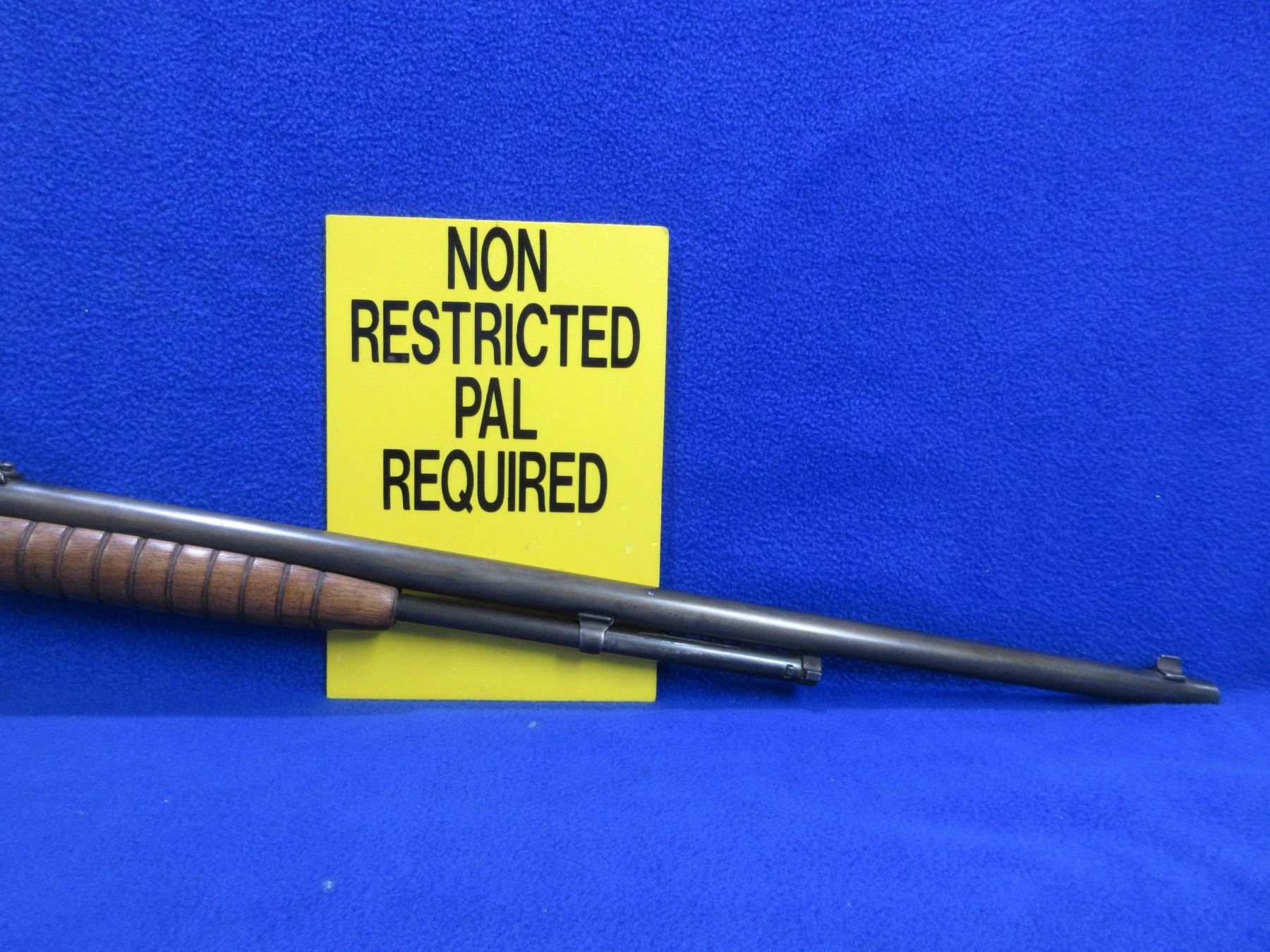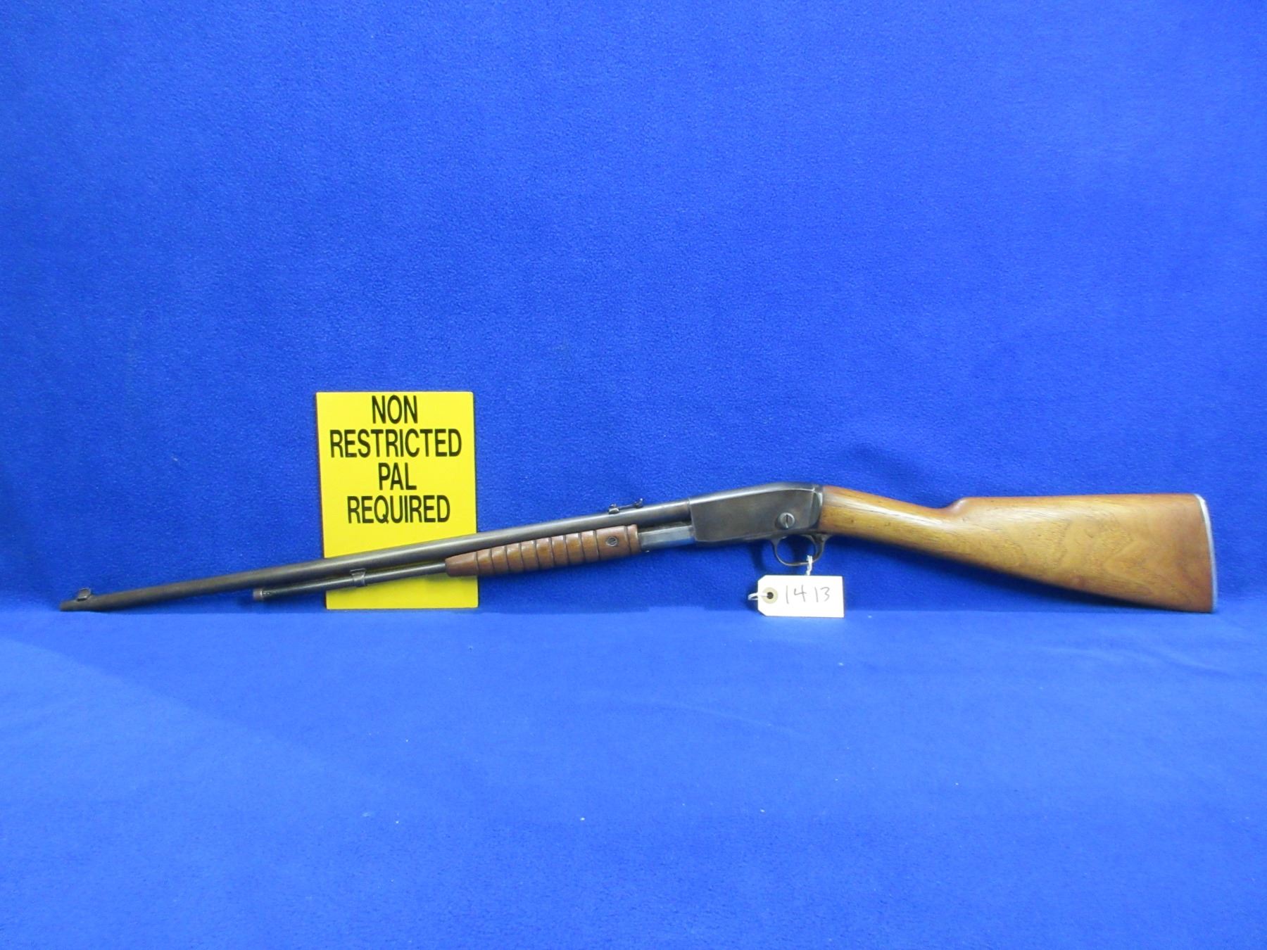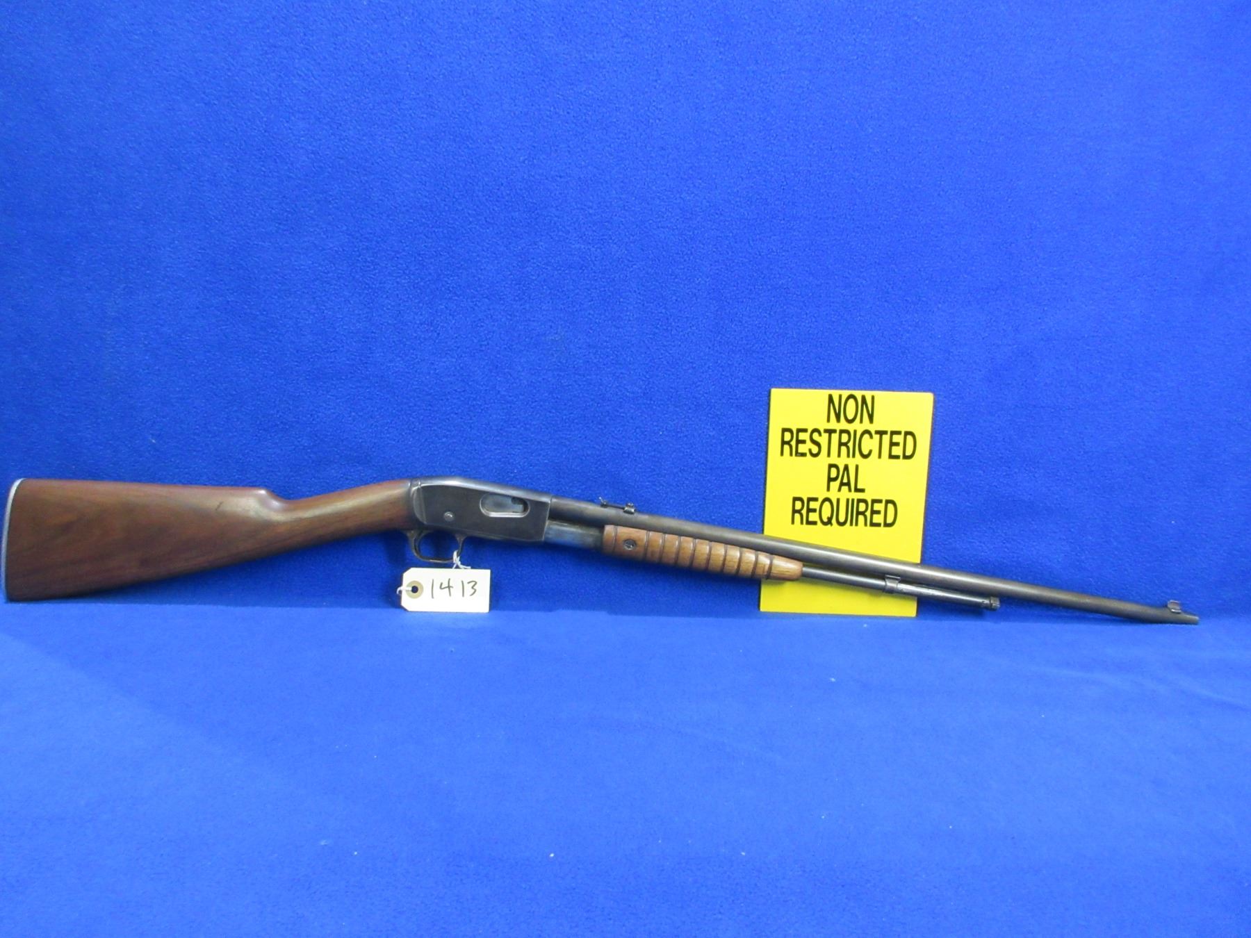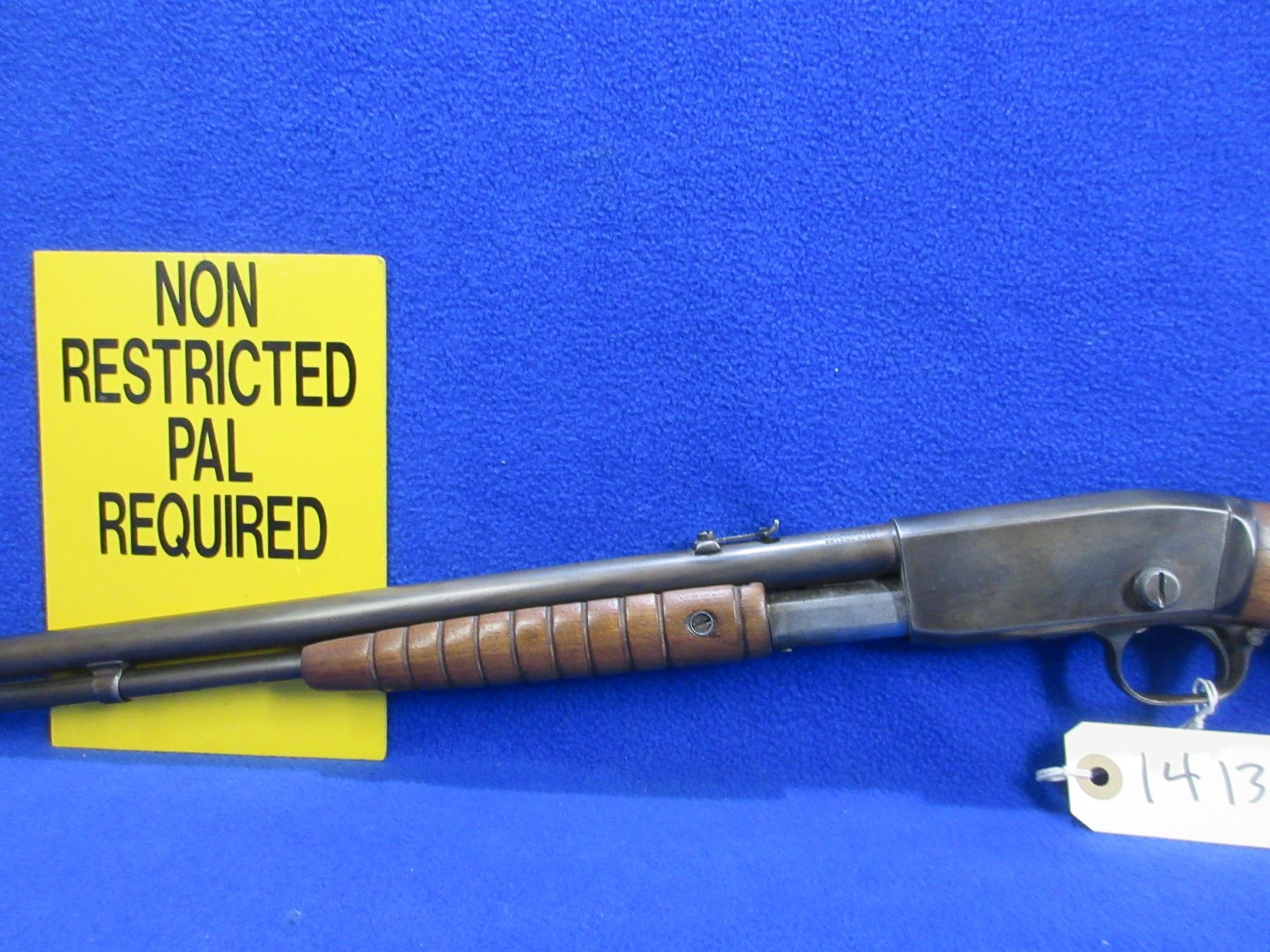 Non-Restricted - Remington Model 12 in 22 LR - This is a pump action takedown rifle with tube magazine, action appears to be in good to very good working order. Barrel is 22", rifling is poor, bluing is mostly grey, has both sights, stock has a hairline crack down the middle in the wrist area on both sides, forearm is good to very good, length of pull is 13", butt plate is non original piece of aluminum. Ser # 165268