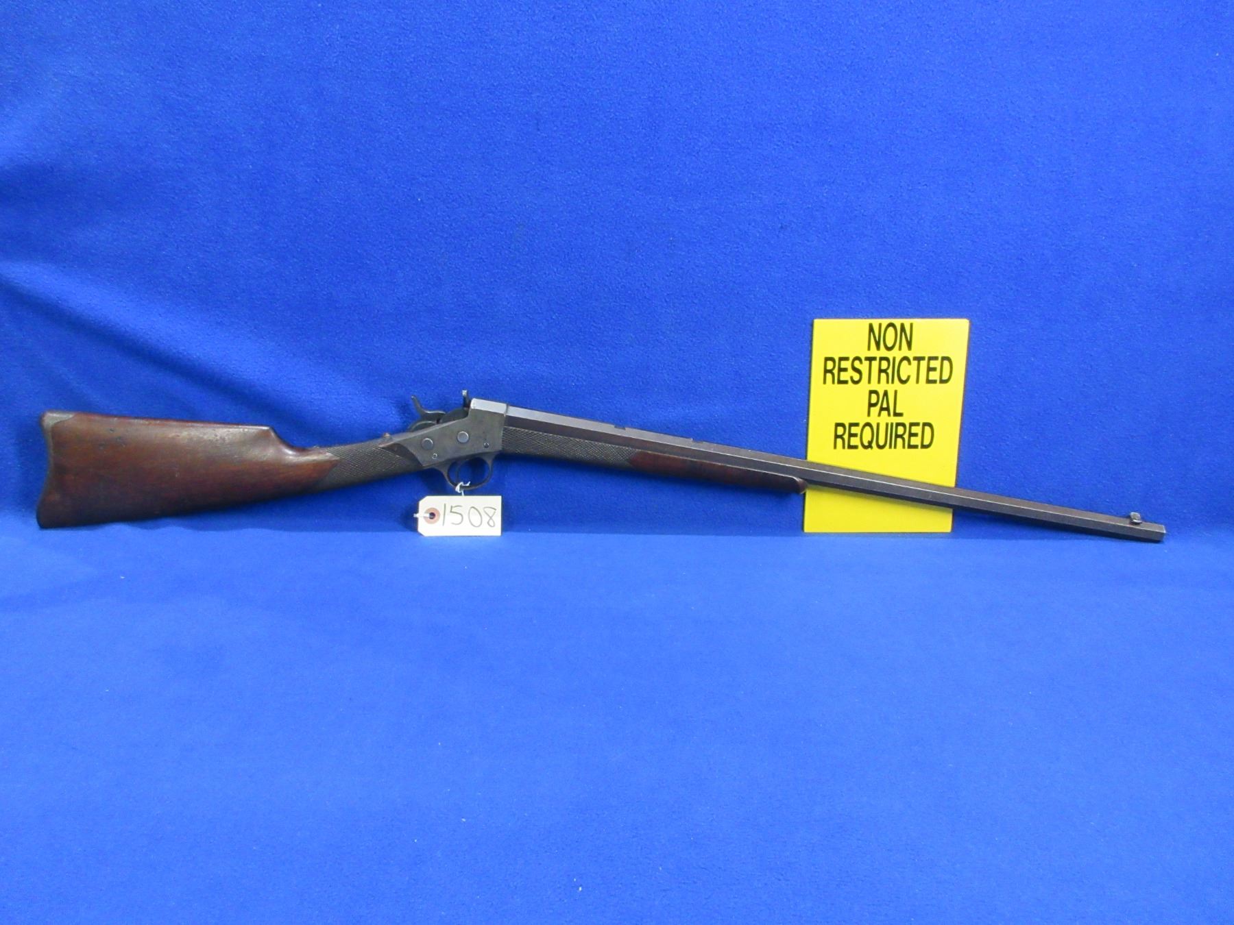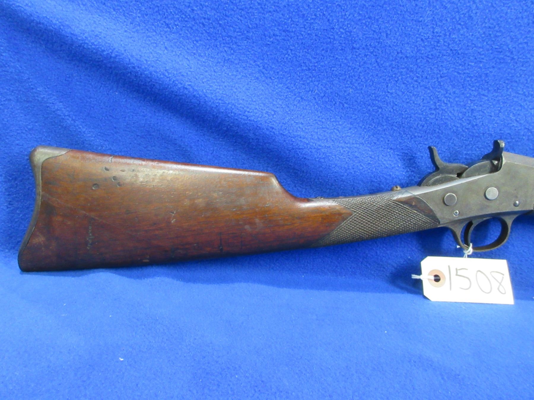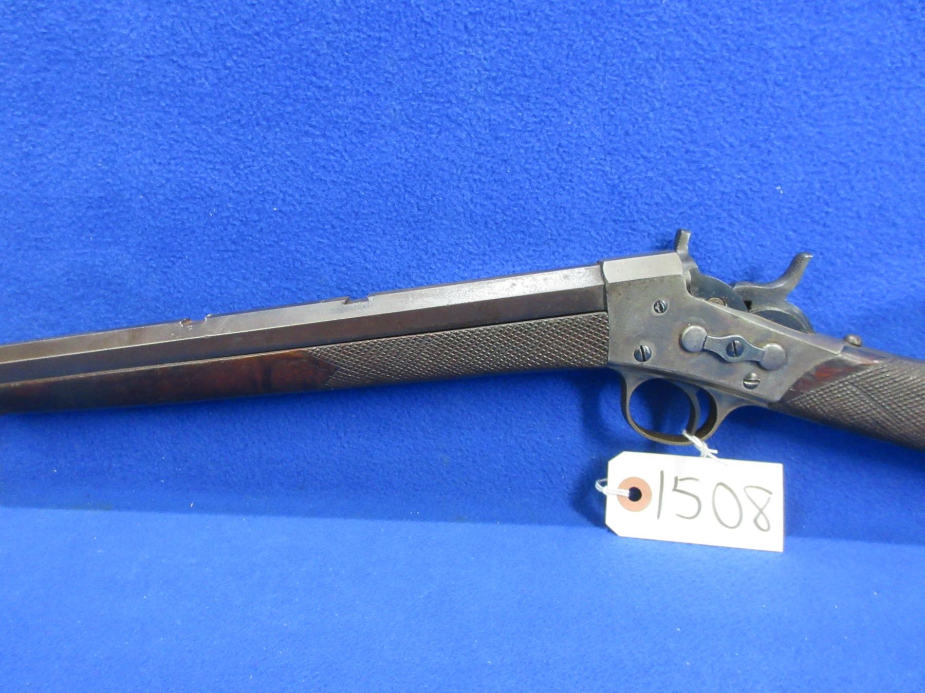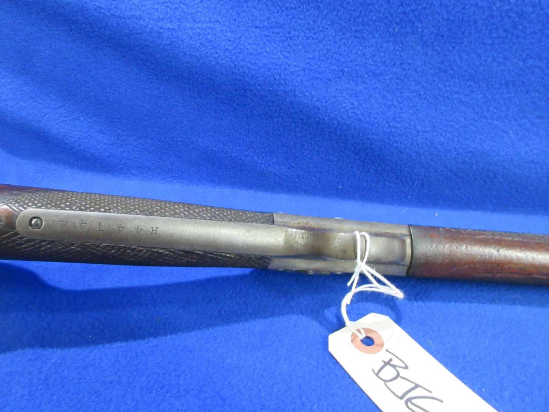 Non-Restricted - Remington Rolling Block 1 1/2 in 25-20 single shot - This single shot rolling block rifle appears to be in good to very good working order. Octagon barrel is 24", rifling is good to very good, bluing is good for age but is starting to turn brown, has front sight but rear sight is missing (rifle has two dovetails for rear sight), stock and forearm are good for age with many usage marks, rear tang has an incorrect screw, metal crescent butt plate good. Ser # H44144