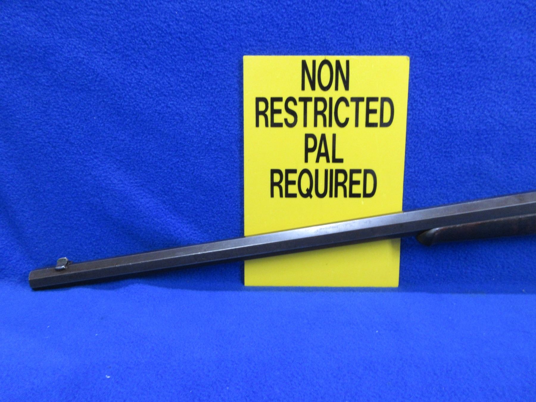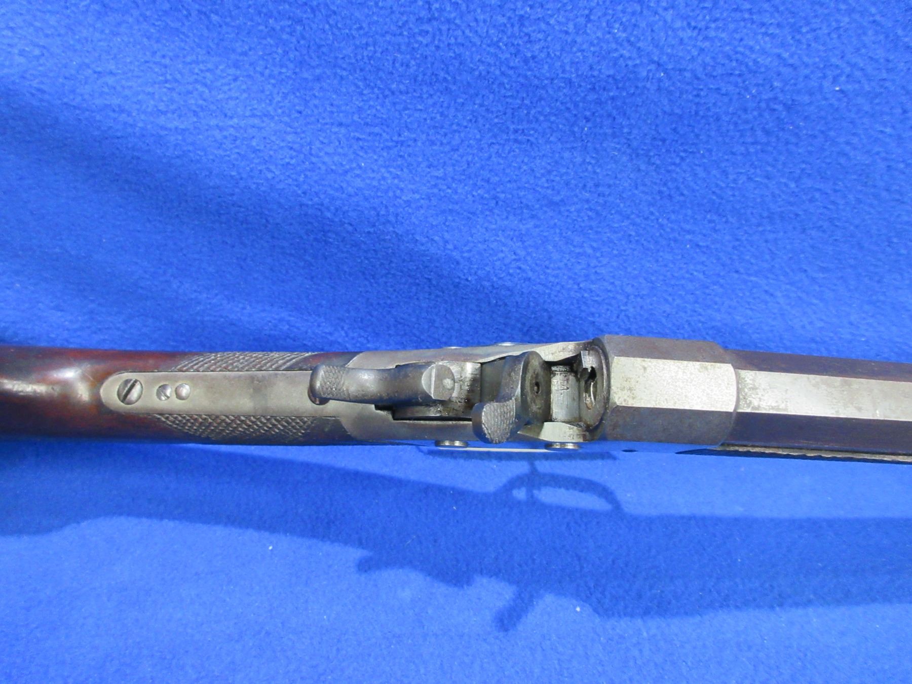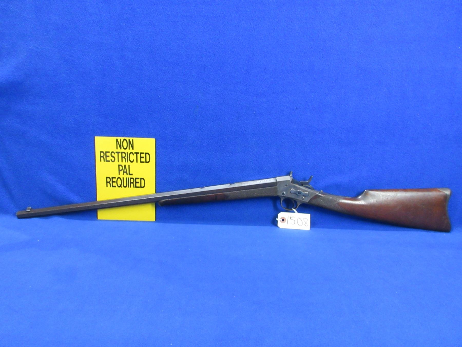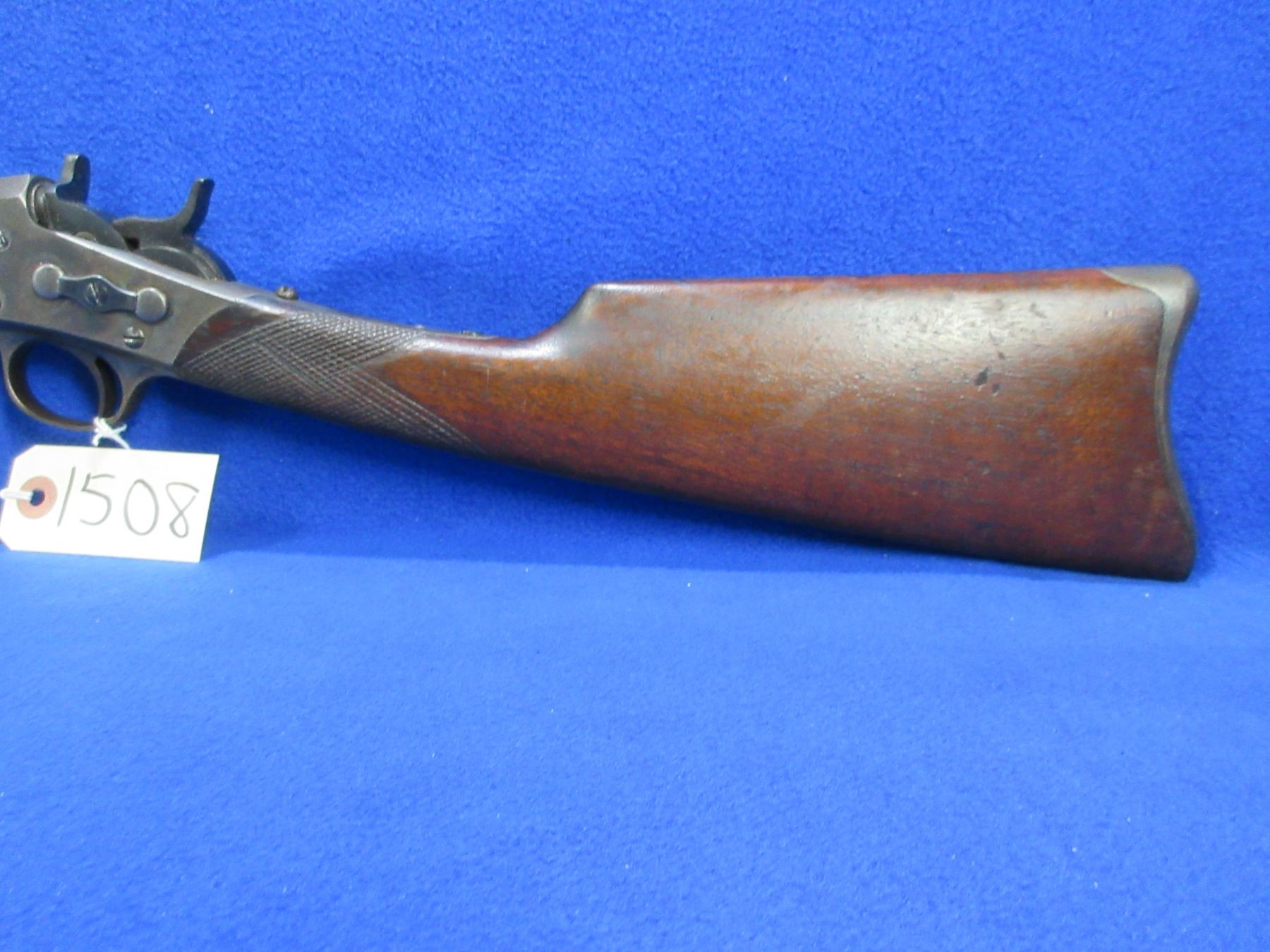 Non-Restricted - Remington Rolling Block 1 1/2 in 25-20 single shot - This single shot rolling block rifle appears to be in good to very good working order. Octagon barrel is 24", rifling is good to very good, bluing is good for age but is starting to turn brown, has front sight but rear sight is missing (rifle has two dovetails for rear sight), stock and forearm are good for age with many usage marks, rear tang has an incorrect screw, metal crescent butt plate good. Ser # H44144