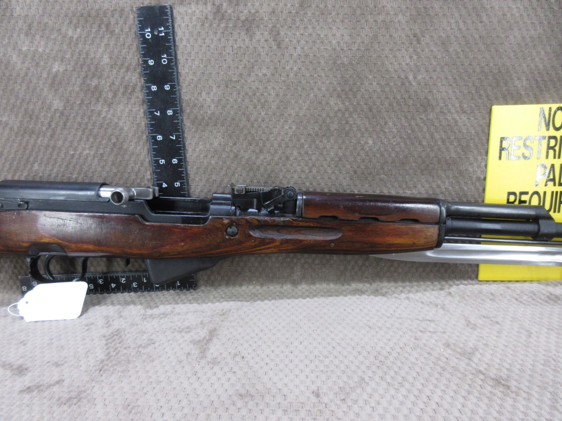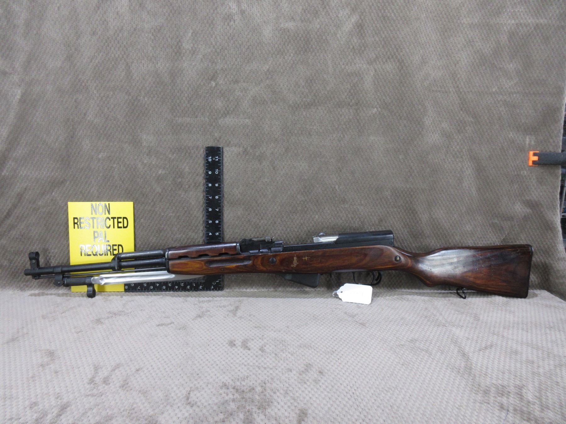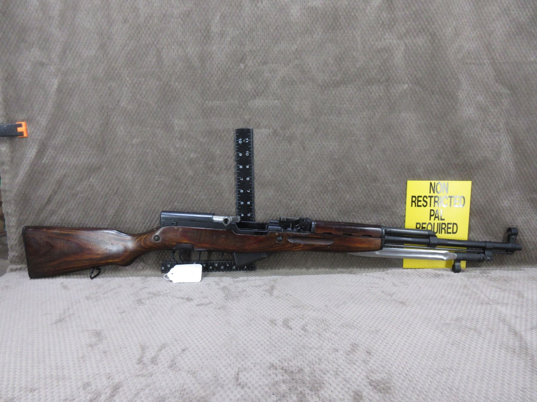 Non-Restricted - Russian SKS in 7.62 x 39 - This semi-auto rifle with magazine appears to be in good to very good working order. Barrel is 20 1/2", bluing is good to very good, rifling is good as it has wear and is somewhat dark, has both sights, stock good with usual marks, butt plate good, no cleaning kit in stock, magazine is incorrect serial #, all others match, Ser # 3358