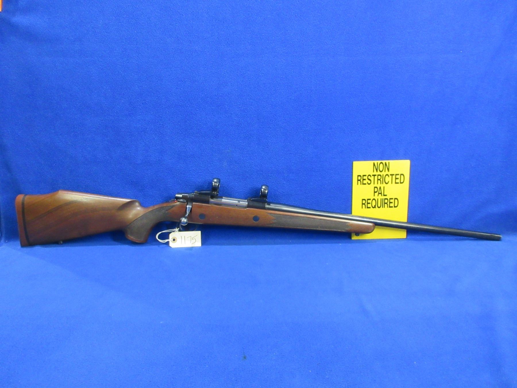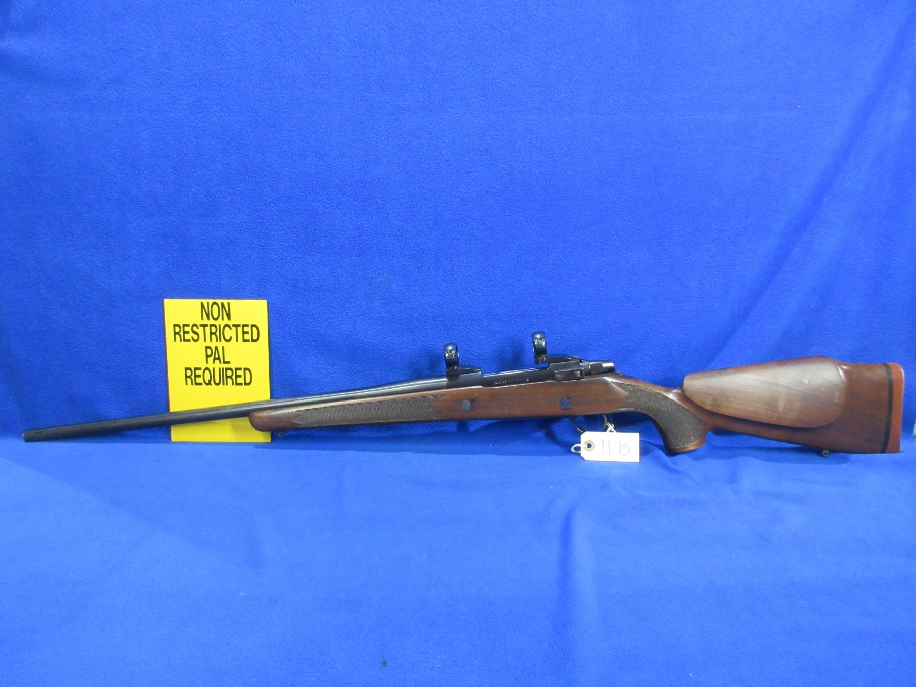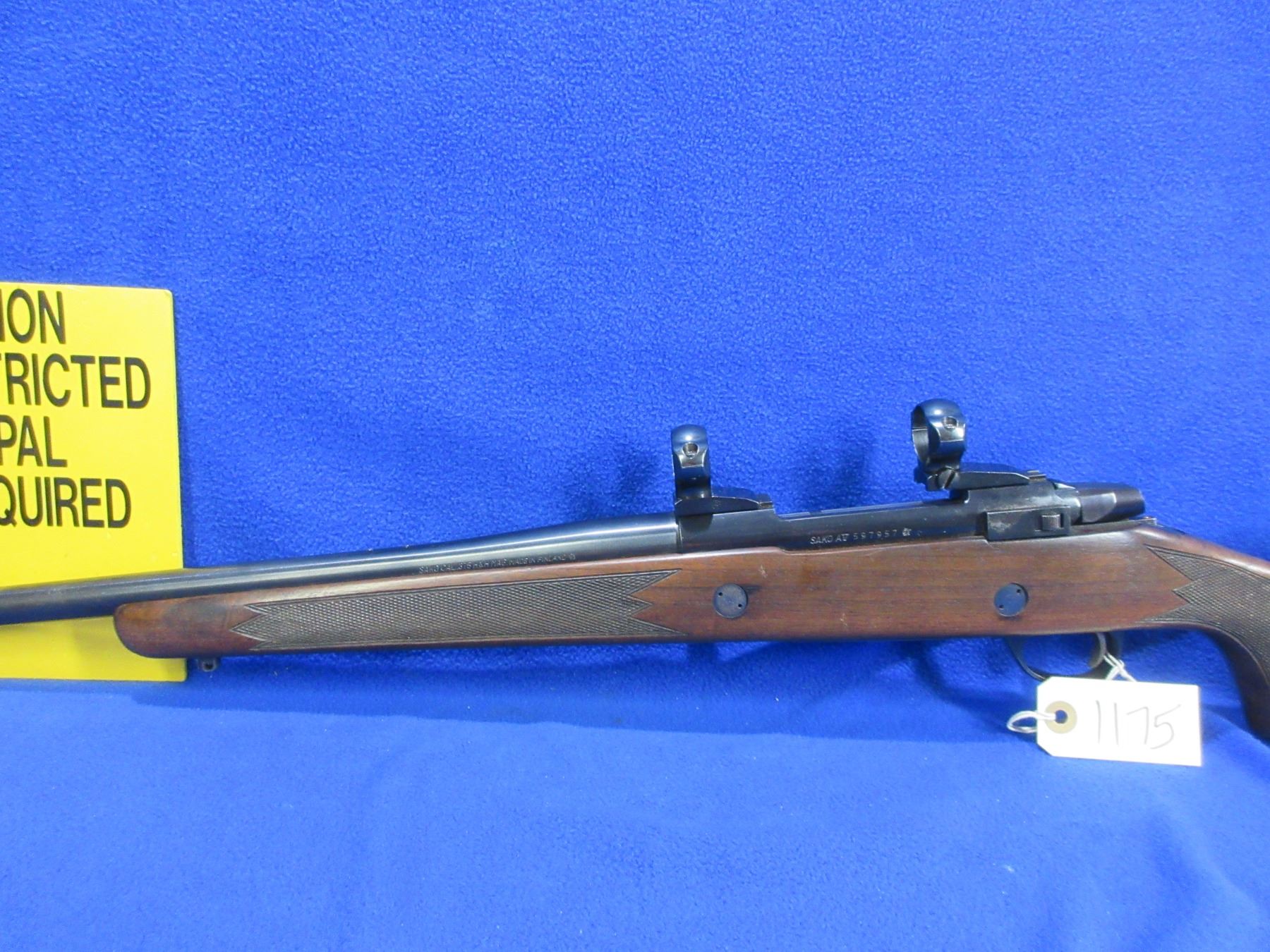 Non-Restricted - Sako Model AV in 375 H&H - This is a bolt action rifle with floorplate magazine, action appears to be in good to very good working order. Barrel is 23", rifling is good to very good, bluing is good with some light speckling, sights are missing but has Redfield 1" rings, stock is good to very good with usage marks, length of pull is 14", rubber recoil pad good, comes with swivel studs. Ser # 597957